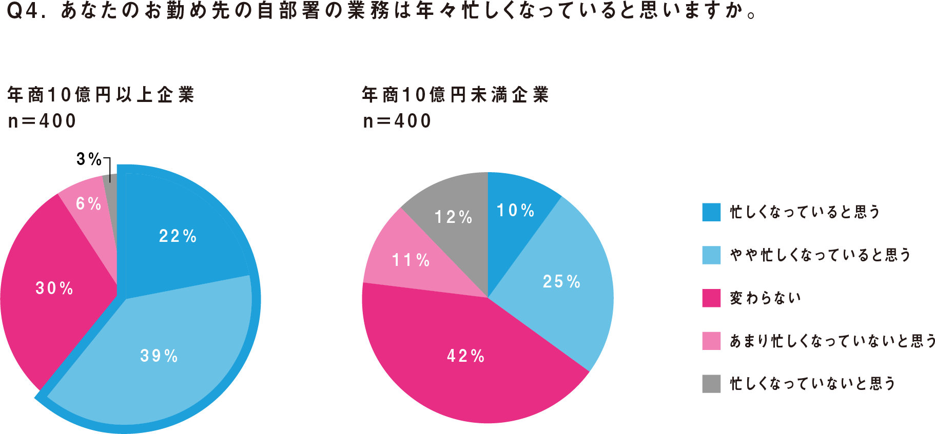 勤め先の自部署の業務が年々忙しくなっているか聞いたところ、年商10億円以上の企業では「忙しくなっている」と感じている人は22%、「やや忙しくなっている」と感じている人は39%という結果になり、6割以上の人が忙しいと感じていることが窺えます。「忙しくなっていない」と感じている人は全体の9%であり、経理の業務が楽になっていると感じている人は少数派でした。