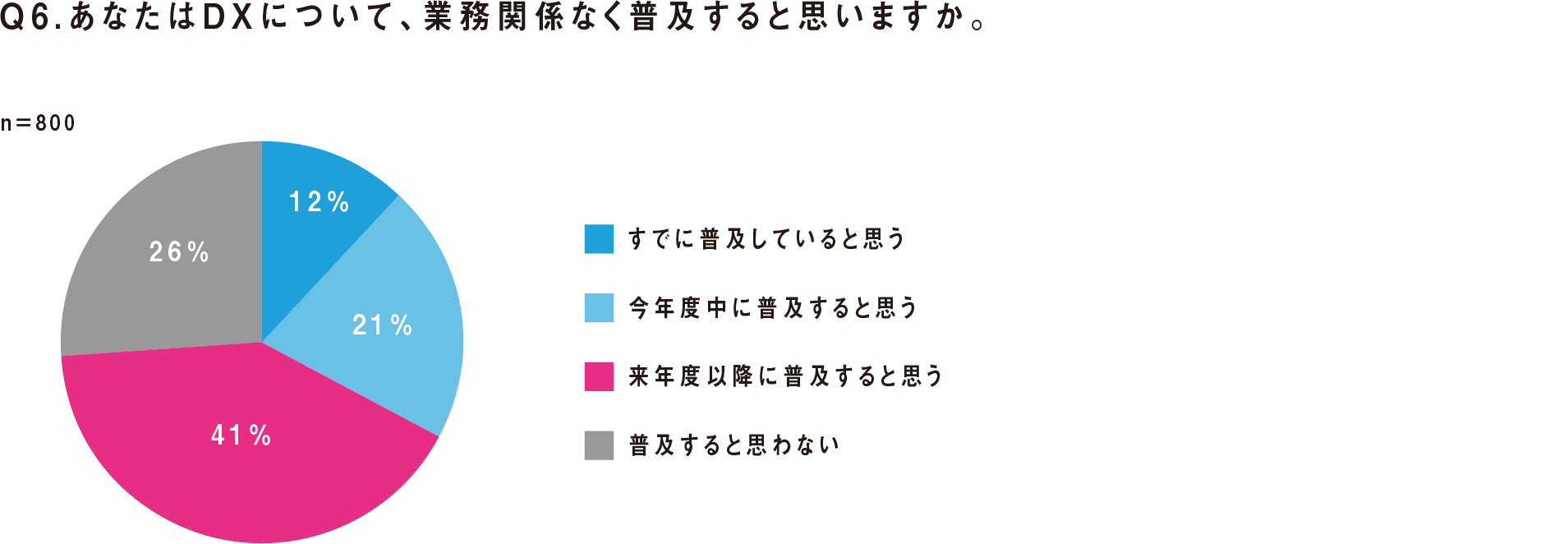 近年のトレンドワードであるDX(デジタルトランスフォーメーション。ここでは『デジタルによる変革』と選択肢に注釈)の普及に対する注目度を聞いたところ、11%が「すでに普及している」と回答し、身の回りの変革を感じていました。21%が「今年度中に普及する」、41%が「来年度以降に普及する」と回答しました。