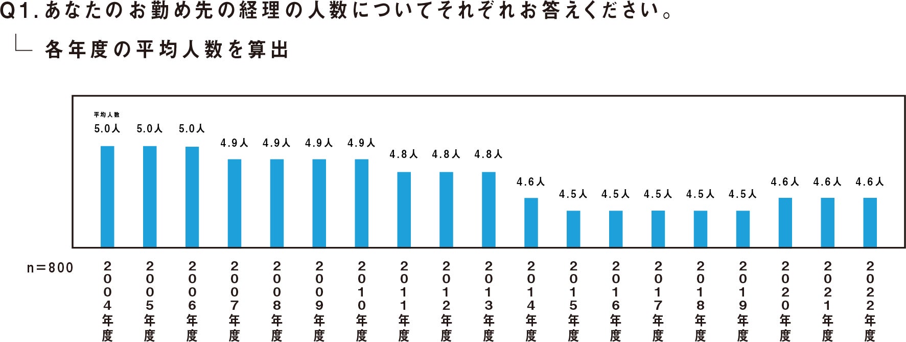 2004年から2022年までの期間で経理部門の人数を聞いたところ、2019年度から2020年度にかけてわずかに増加はしているものの全体で見ると経理の人数は減少傾向となり、調査結果から毎年の平均人数を算出したところ19年間で5.0人から4.6人に減っていることがわかりました。また、勤め先で経理の新たな採用予定があるかという質問に対しては全体の78%が「2022年度の採用予定はない」と回答しました。