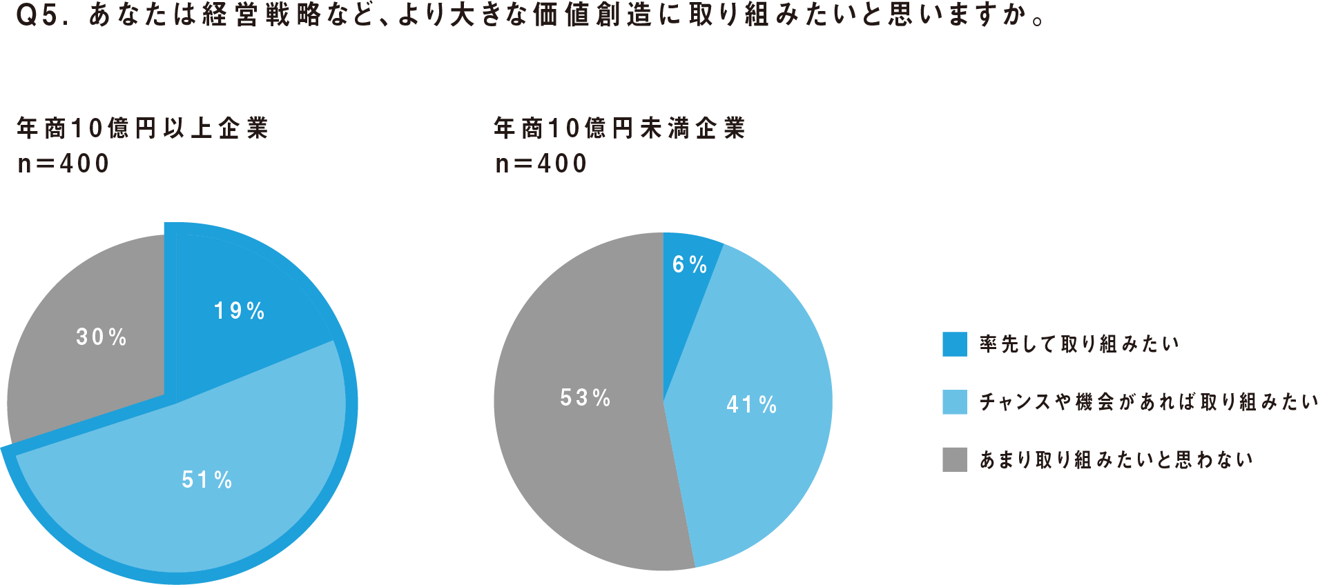 現在行っている業務への満足度を「今よりも大きな価値創造に取り組みたいと感じますか?」という質問にて聞いたところ、年商10億円以上の企業に勤める経理では、19%が「率先して取り組みたい」51%が「チャンスや機会があれば取り組みたい」と回答し、過半数が今以上の大きな価値を創造する仕事をしたいと感じていることがわかりました。対して年商10億円未満の企業に勤める経理では、6%が「率先して取り組みたい」41%が「チャンスや機会があれば取り組みたい」と回答しました。