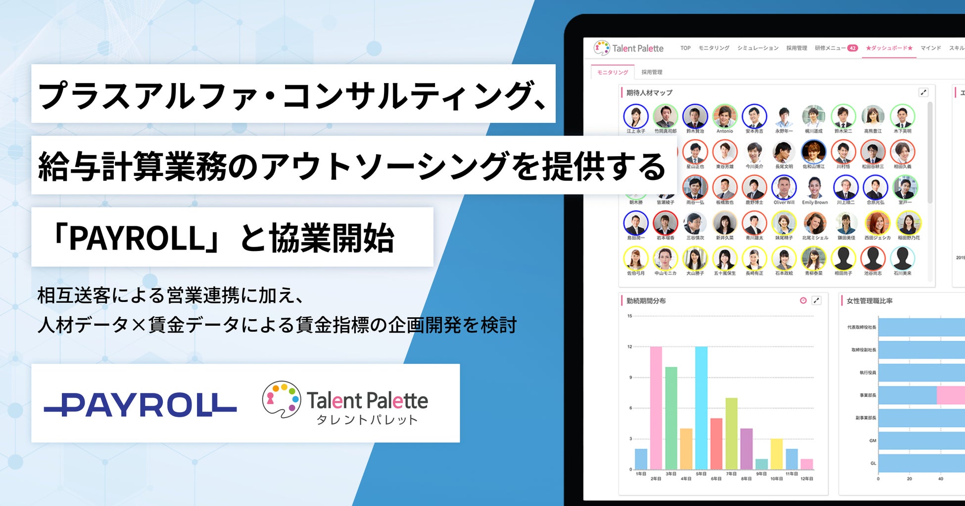 株式会社プラスアルファ・コンサルティング(本社:東京都港区、代表取締役社長:三室克哉、以下「PAC」)と株式会社ペイロール(本社:東京都江東区、代表取締役社長兼CEO 湯浅哲哉、以下「PAYROLL」)は、営業面での協業に加え、人事制度設計に活用できる賃金指標等、共同サービスの企画検討を開始しました。