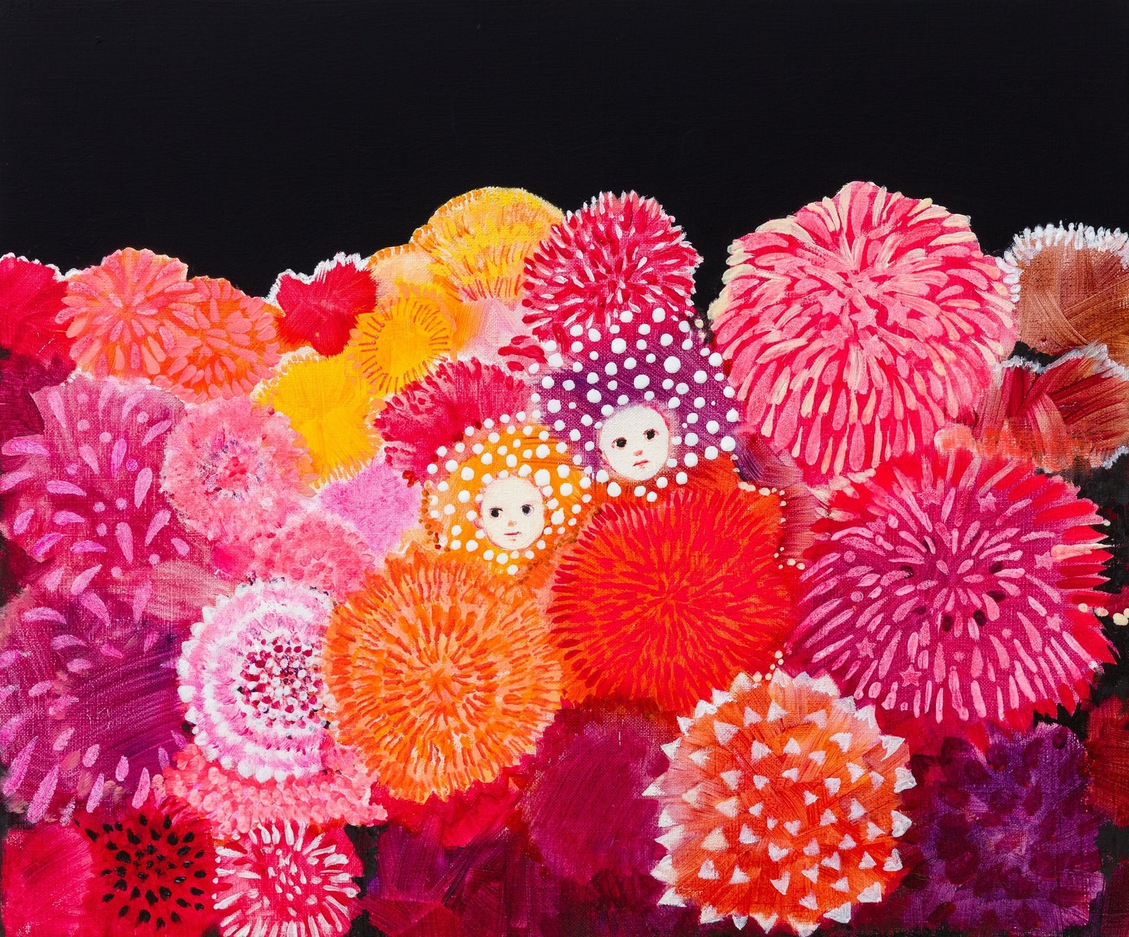 今回の企画展では、カレンダーとその原画を展示販売するとともに、文喫 六本木のブックディレクターが、カレンダーに描かれた一つひとつの花の「花言葉」にちなんで選んだ本を、約150点並べます。漆黒からきらめくように浮かび上がる花の鮮やかさ、背景とモチーフの相反する質感が生むどこか謎めいた雰囲気、見る者によってさまざまに見える人物の表情。想像力をかき立てる田中さんの絵の世界を、その花がもつ意味と、ブックディレクターによる選書がさらに膨らませます。