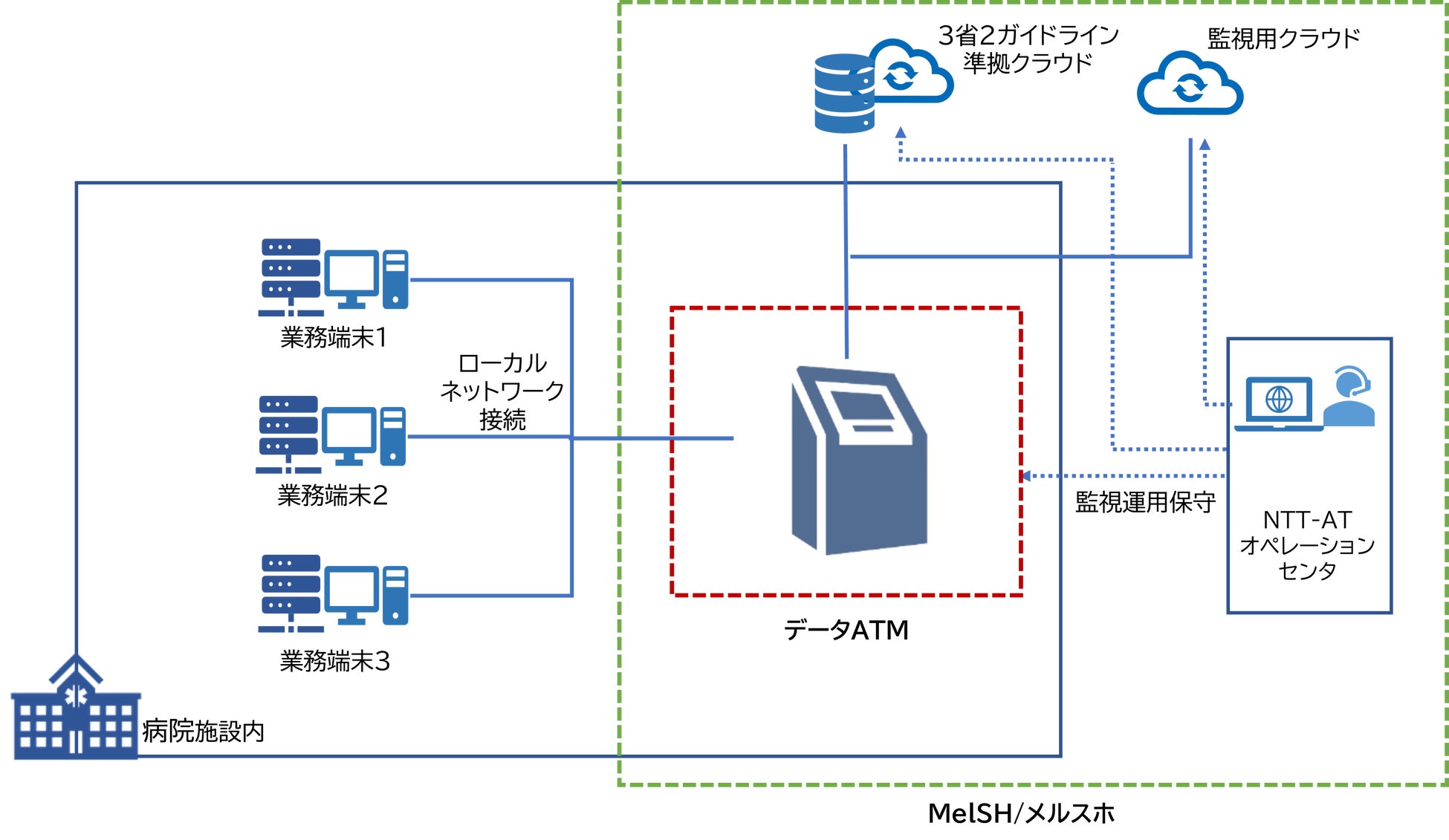 本サービスは、クラウドストレージとそれに接続するネットワーク・専用設備(データATM)とその運用管理を提供します。