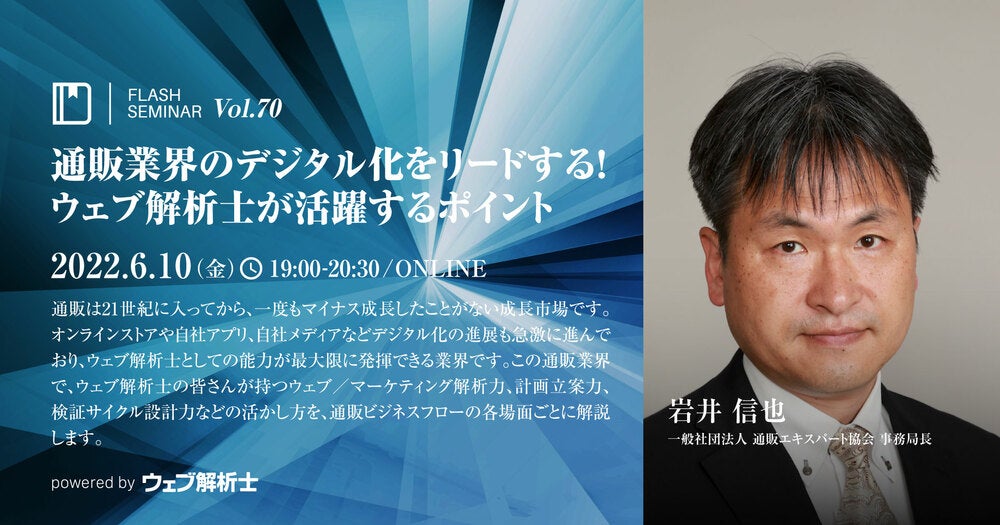2022/6/10(金)19:00-20:30 FlashセミナーVol.70【無料】通販業界のデジタル化をリードする!ウェブ解析士が活躍するポイント