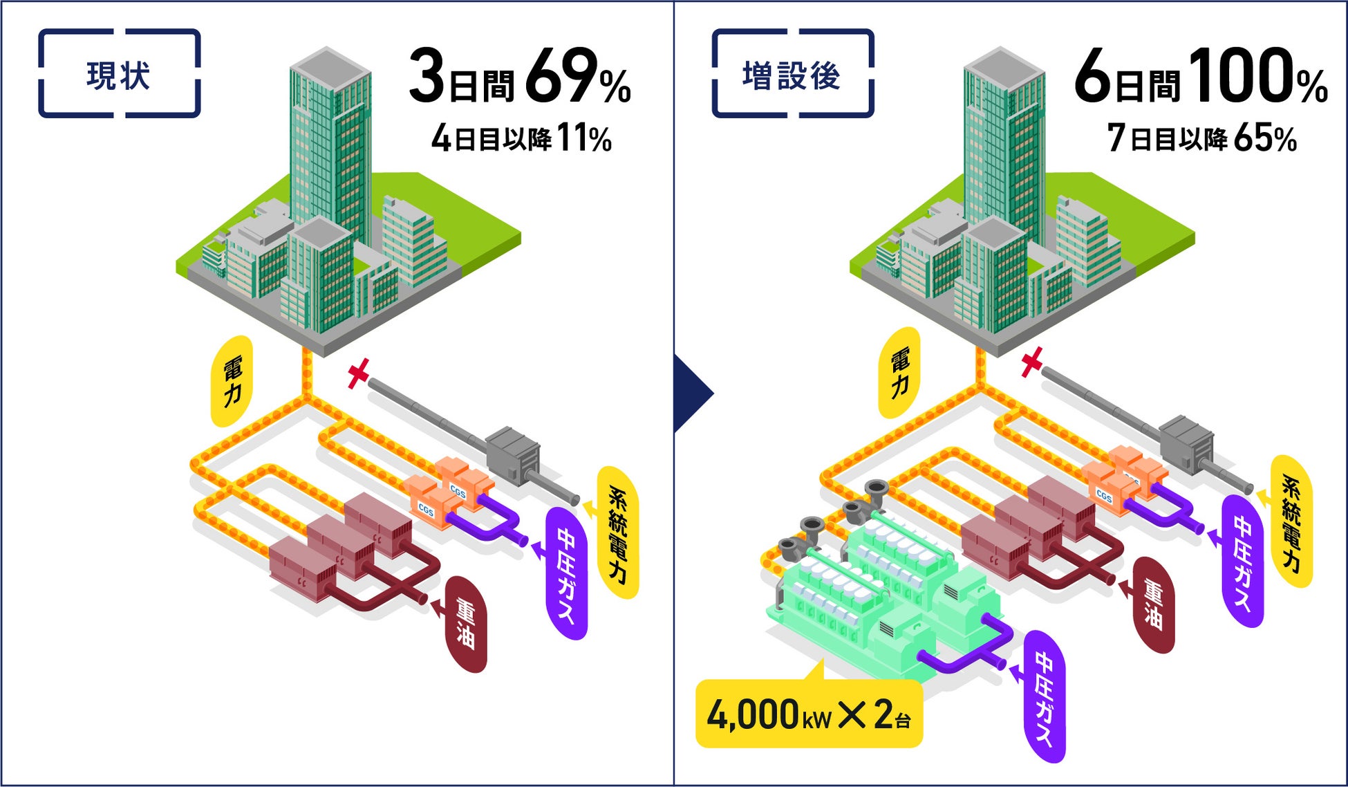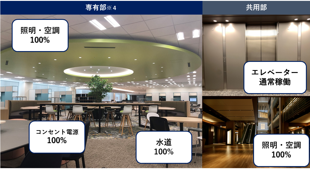 非常用発電機増設後は、6日間、オフィス・ホテル・住宅(共用部)・商業店舗へ通常時と変わらない電力を供給することができます。また、7日目以降は、オフィステナントの事業継続に可能な電力を供給することができます。(※3)