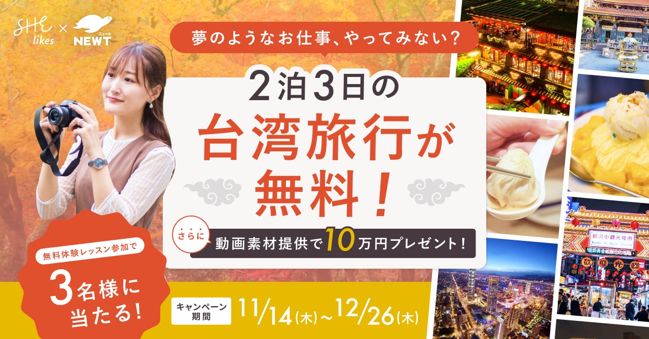学ぶから働くまでを支援する女性向けキャリアスクール「SHElikes(シーライクス)」を運営するSHE株式会社(所在地:東京都港区、代表取締役CEO/CCO:福田恵里、以下SHE)は、海外旅行予約アプリ『NEWT(ニュート)』を運営する株式会社令和トラベル(所在地:東京都渋谷区、代表取締役社長:篠塚 孝哉)と連携し、台湾2泊3日の旅行を無料で楽しみながら、旅行先で動画素材の撮影をして納品していただくことで10万円をプレゼントする「夢のようなお仕事、やってみない?」を、11月14日(木)から12月26日(木)の期間で実施します。