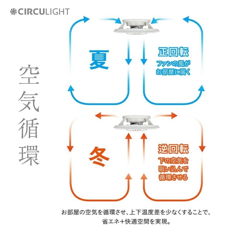 夏は正回転でファンの風をお部屋に届け、冬は逆回転で床付近の冷たい空気を吸いこんで循環させることができます。部屋の空気を循環させることで空調効率を高め快適な空間を実現します。
