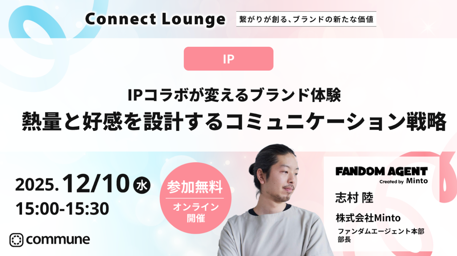 株式会社Minto(本社:東京都港区、代表取締役:水野和寛、以下 Minto)は、相互交流で信頼を育む「Commune」を提供するコミューン株式会社が開催するオンラインカンファレンス「Connect Lounge 〜繋がりが創る、ブランドの新たな価値〜」(以下、Connect Lounge)に、広告主とファンダムを繋ぐ広告プロデュースチーム「FANDOM AGENT(ファンダムエージェント)」として、登壇することをお知らせします。