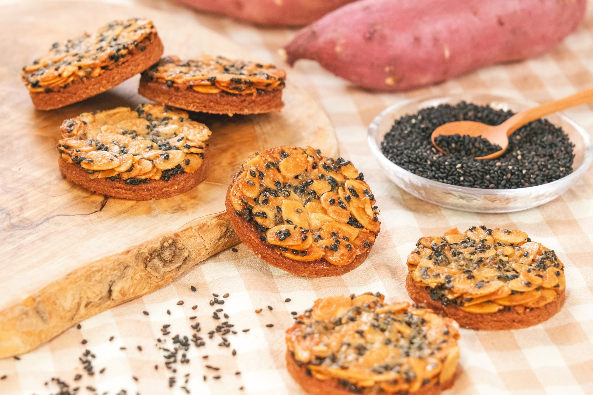 紫いもと黒ごまをたっぷり使った、温かいお茶と一緒に食べたくなる和のフロランタンを作りました。大学芋のようにほっこりする風味ですが、黒ごまの味を際立たせているので甘さは控えめ。和菓子を思わせる奥ゆかしい香ばしさが広がります。