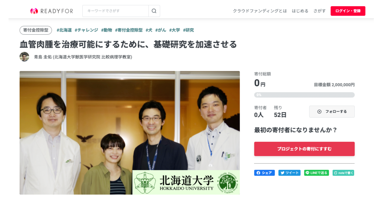 また提携後第一号としてクラウドファンディングプロジェクト「血管肉腫を治療可能にするために、基礎研究を加速させる」を公開し、200万円を目標に11月1日(火)9時から寄付金を募集いたします。