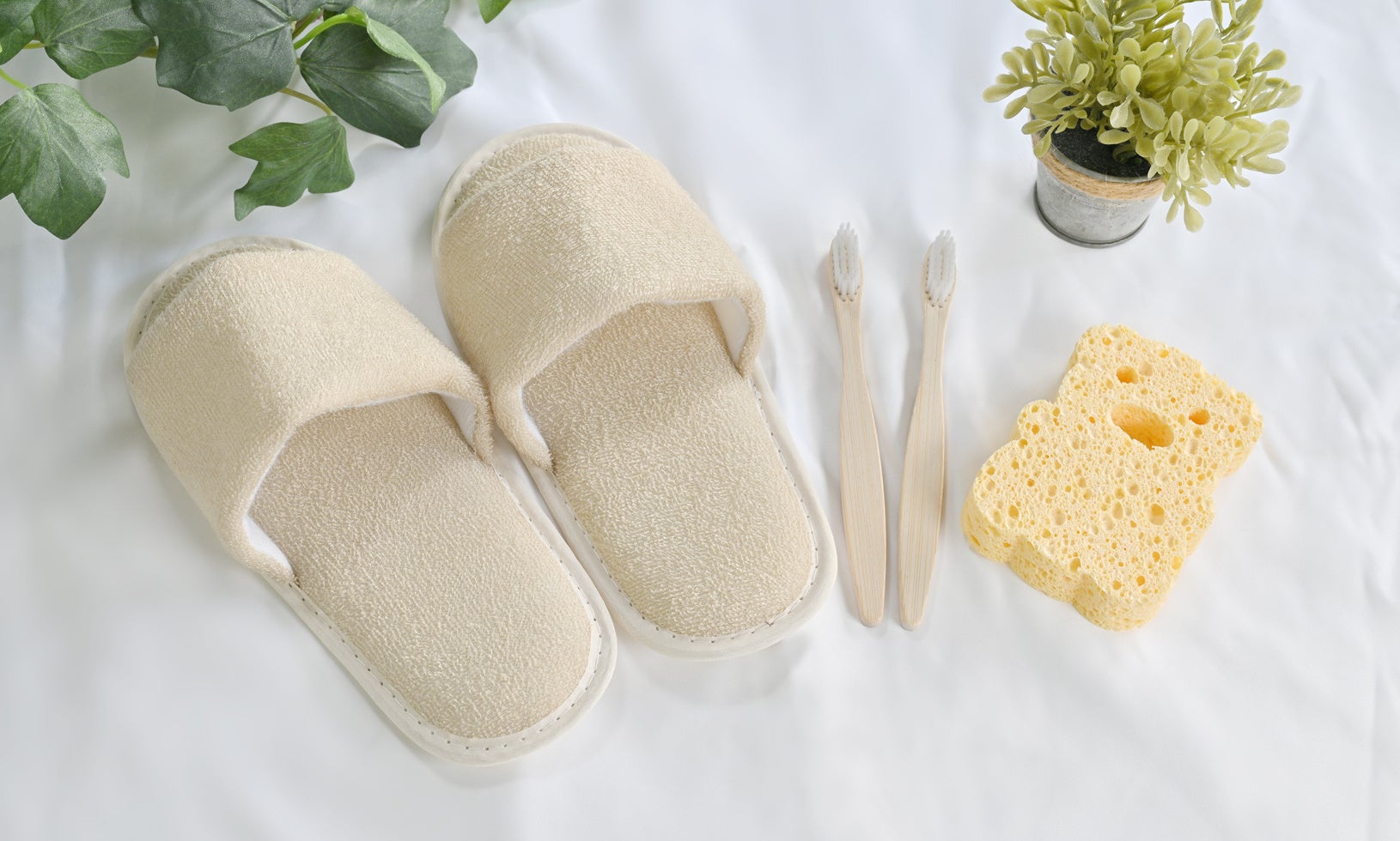 SUSamenityシリーズに、初のこども用製品が3種登場。底面に麦わらを再利用したパイル地スリッパ、木材パルプを使用したボディスポンジ、竹歯ブラシを発売します。こども用のアメニティのお問い合わせが多数あった経緯から制作され、お子様用に可愛いデザインを追求しながらも、上質なホテル様にも合う落ち着いた色味に仕上げました。「こども用アメニティもエコ素材で統一したい」「ご家族で宿泊されるお客様の満足度を高めたい」などのお悩みを抱えるホテルのアメニティ担当者様にお喜びいただける製品です。