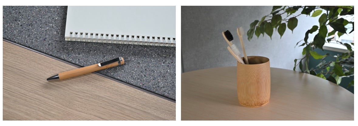 客室備品を販売するSUS supplyからは、自然由来の天然竹を使用したボールペン、コップ、ソープトレイ、コースターが新登場。竹は成長スピードが早く、定期的な間伐が必要となります。その資源を有効活用することで、環境に優しいものづくりへ貢献できます。さらに、伐採した切り株からは新たに再生・成長するため、植え替えの必要がなく土壌への負担もかかりません。エコであることの他にも、竹の繊維感があたたかいデザインと手触りを感じさせる特徴も。高級な雰囲気を感じさせる曲線美や使い勝手のよい仕様にこだわりました。