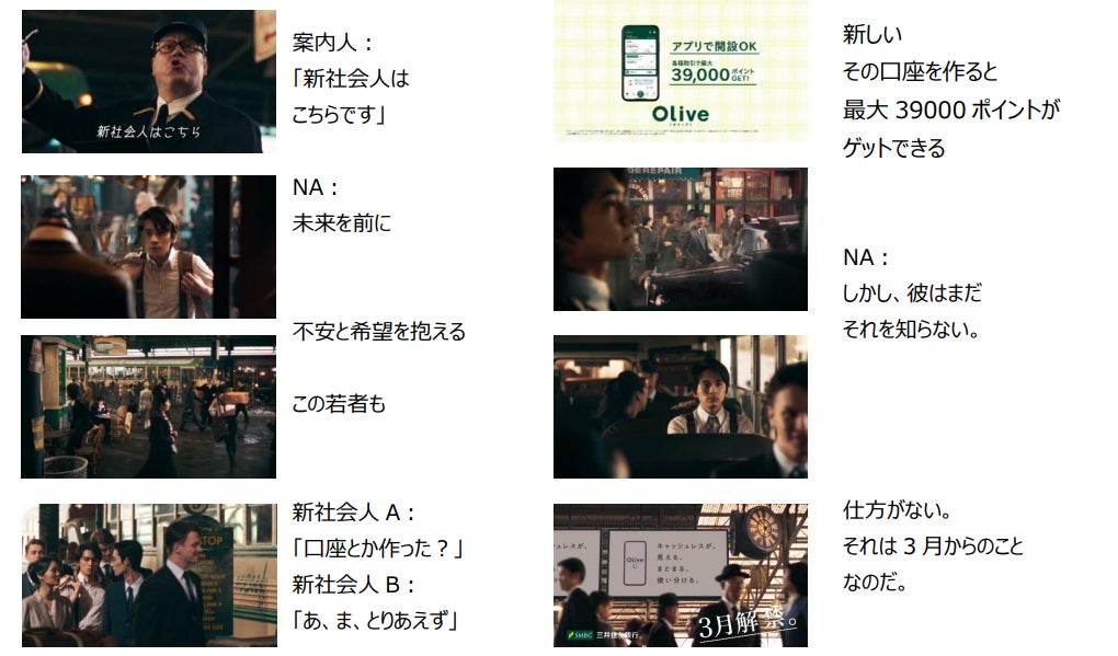 新コミュニケーションでは、「どんな生き方にも、お金は関わる。」というコンセプトの下、三井住友カードのイメージキャラクターとしておなじみの小栗旬さんと、今回から三井住友銀行のイメージキャラクターに就任する北村匠海さんが登場。無数の人々が行き交う架空の巨大ターミナル駅を舞台に、社会人として豊富な経験を積んできた一人の男性(小栗さん)と、新社会人として大人の世界に足を踏み入れる若き青年(北村さん)がそれぞれの立場から、キャッシュレス化が急速に進む世の中での最適なお金の管理や使い方を模索するストーリーを通じて、「Olive」誕生のニュースとその魅力を訴求していきます。