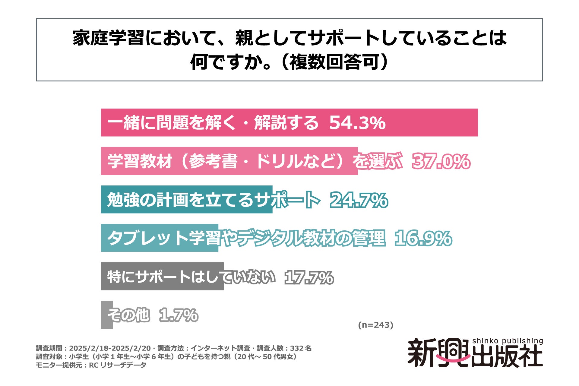 また、お子さんに家庭学習(自宅での自学自習)の習慣があると回答された方に「家庭学習において、親としてサポートしていることは何か」を尋ねる設問への回答では、1位が「一緒に問題を解く・解説する」で54.3%、2位が「学習教材(参考書・ドリルなど)を選ぶ」で37.0%、3位が「勉強の計画を立てるサポート」で24.7%という結果になりました。この結果から、家庭学習では主に、一緒に問題を解き、問題の解説をすることや、学習教材を選ぶ、といったサポートをしている親が多いことが判明しました。