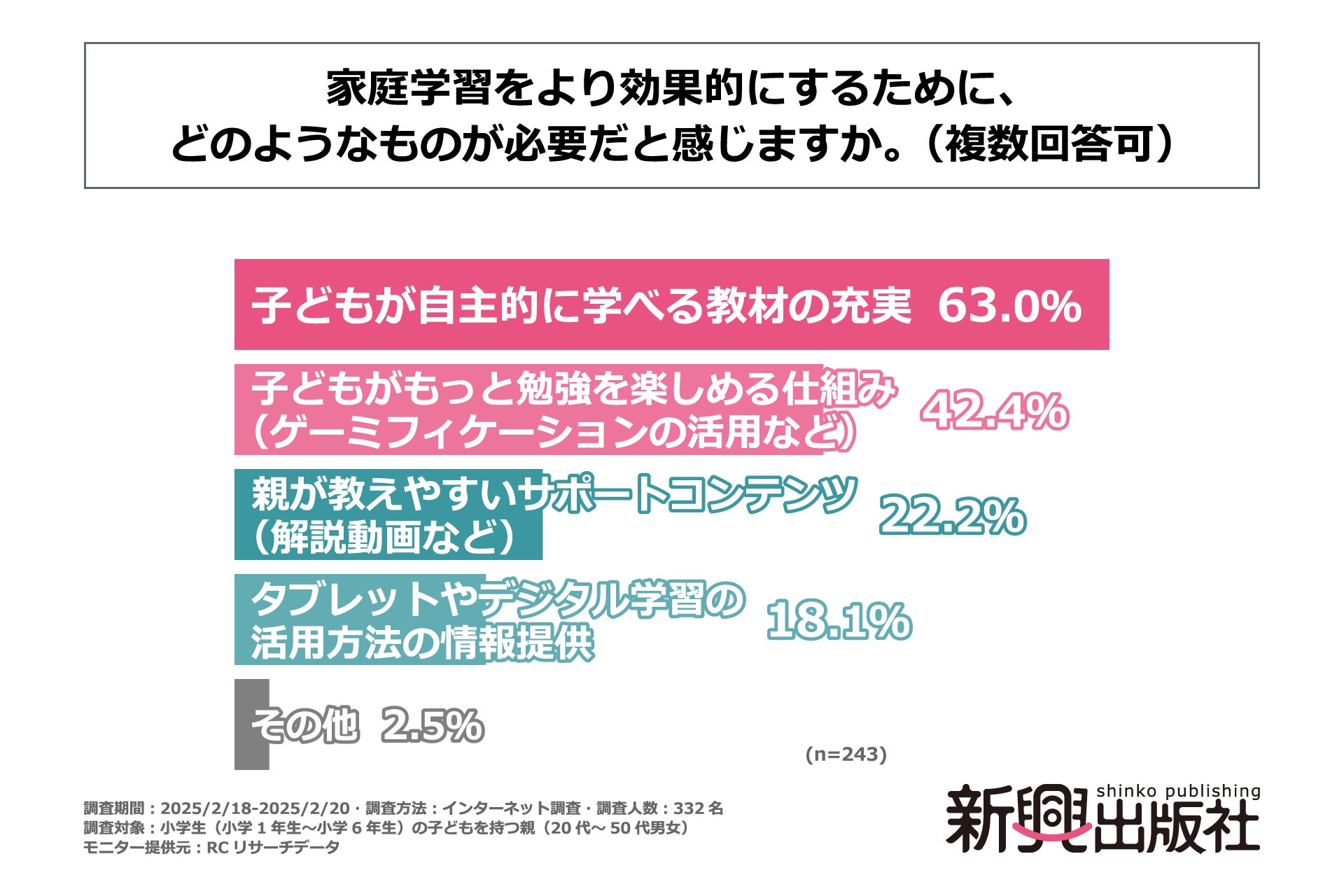 ・家庭学習をより効果的にするために「子どもが自主的に学べる教材の充実」が必要だと考えている親が多い