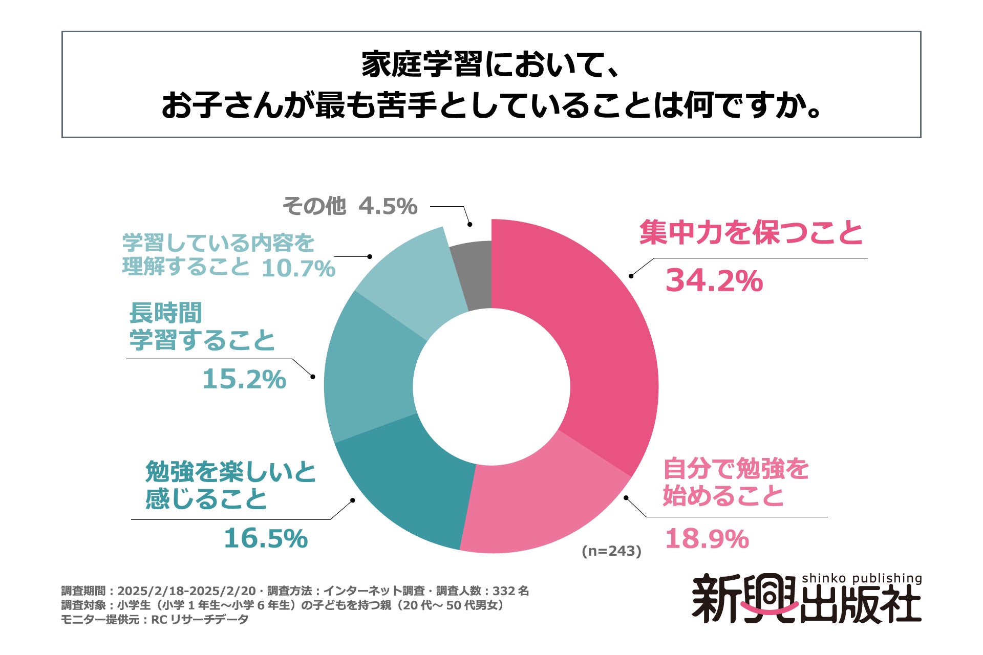 続いて、お子さんに家庭学習(自宅での自学自習)の習慣があると回答された方に「家庭学習において、お子さんが最も苦手としていることは何か」を尋ねる設問への回答では、1位が「集中力を保つこと」で34.2%、2位が「自分で勉強を始めること」で18.9%、3位が「勉強を楽しいと感じること」で16.5%という結果になりました。この結果から、家庭学習において多くの小学生が苦手とすることは「集中力を保つこと」であることが明らかになりました。