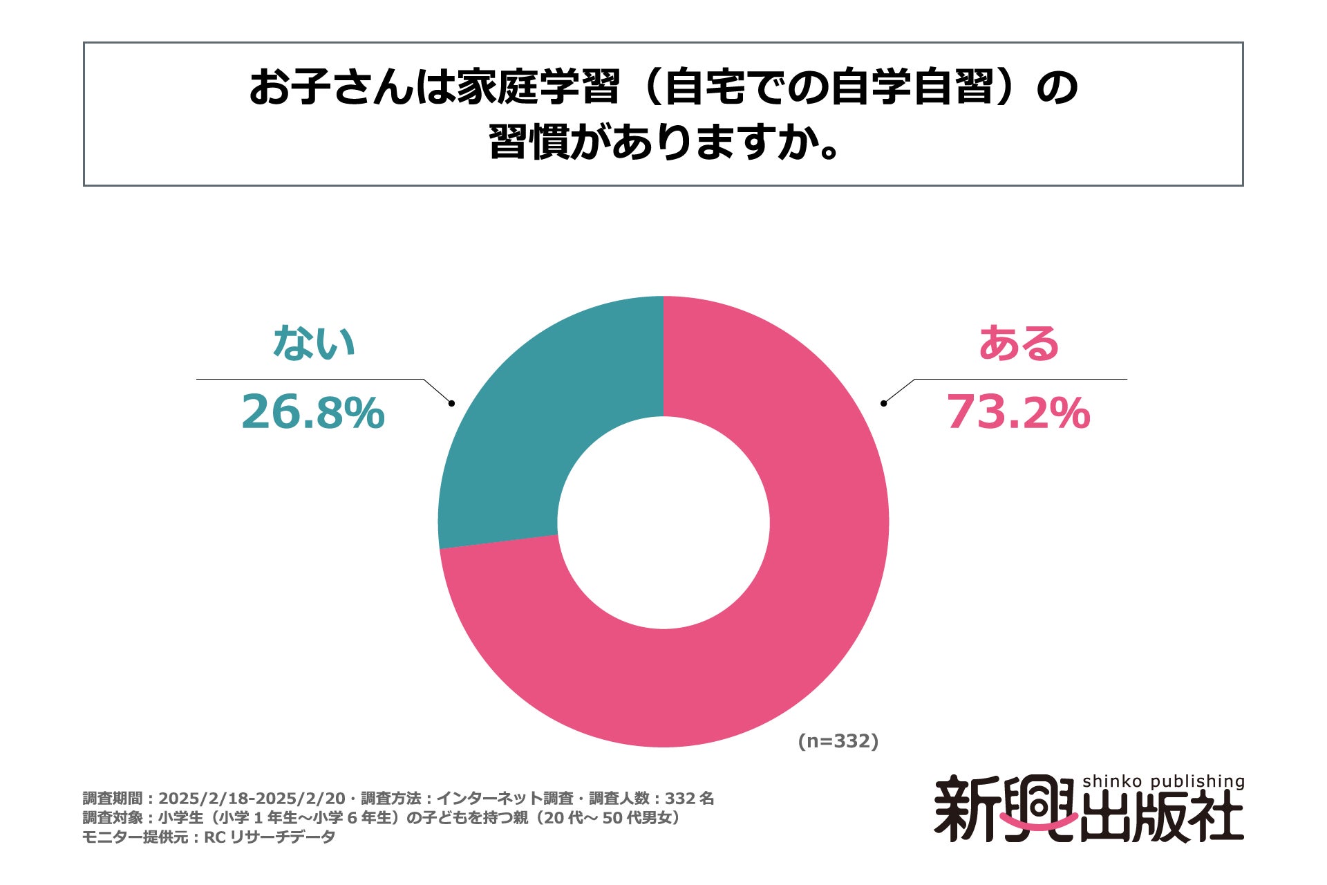 まず、「お子さんは家庭学習(自宅での自学自習)の習慣があるか」を尋ねる設問の回答では、「ある」が73.2%、「ない」が26.8%という結果になりました。この結果、小学生の7割以上は家庭学習の習慣があることが明らかになりました。