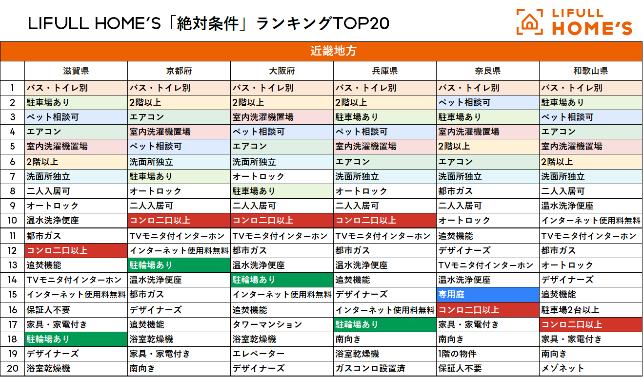 - 【近畿地方】2府4県すべてで「コンロ二口以上」がTOP20位内に、住まいの条件にも食へのこだわりが色濃く。京都、大阪、兵庫、滋賀では生活の相棒“チャリ”のため「駐輪場あり」が上位に。全国TOPとなる奈良の15位「専用庭」にも注目。