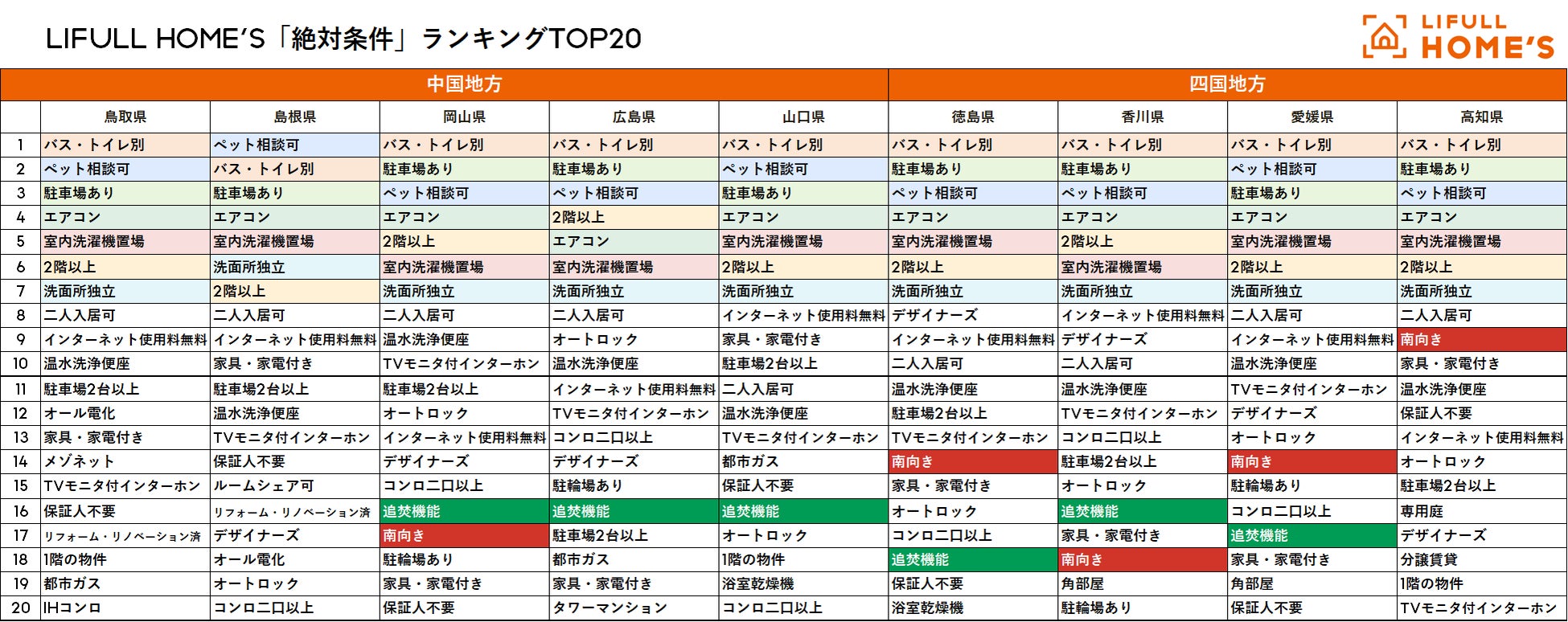 - 「絶対条件」上位は全国不動の7条件!唯一、「バス・トイレ別」よりも「ペット相談可」が勝(まさ)った島根県