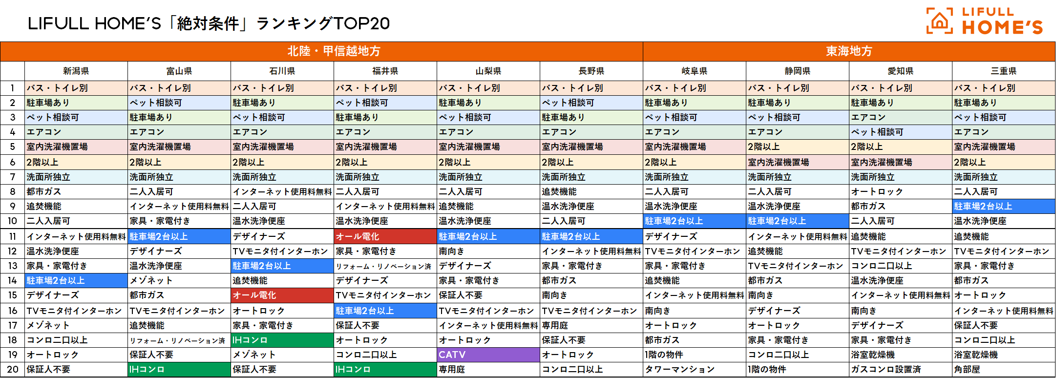 - 【北陸・甲信越・東海地方】北陸3県は使い慣れた「オール電化」「IHコンロ」を重視。新潟・富山・石川も冬シーズンにも採光を期待できる「メゾネット」推し。山梨県では「CATV」対応か要チェック!
