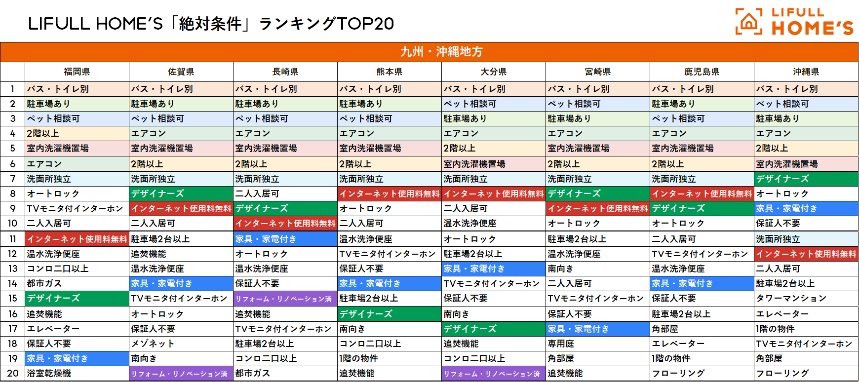 - 【九州・沖縄地方】九州・沖縄地方では「インターネット使用料無料」が人気条件に。「デザイナーズ」「家具・家電付き」は沖縄を筆頭に、8県すべてでTOP20入り!「リフォーム・リノベーション済」も佐賀、長崎、大分で注目条件に!