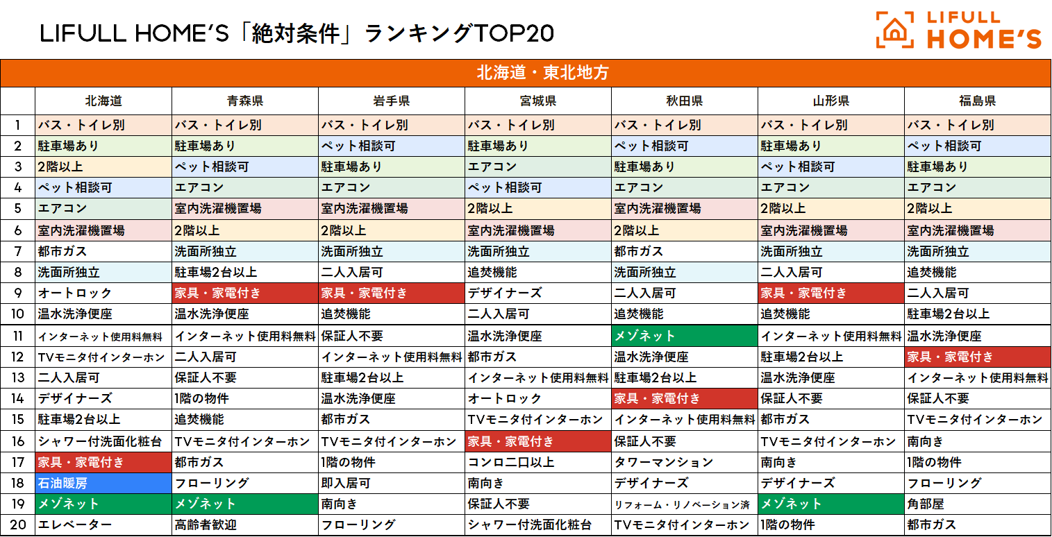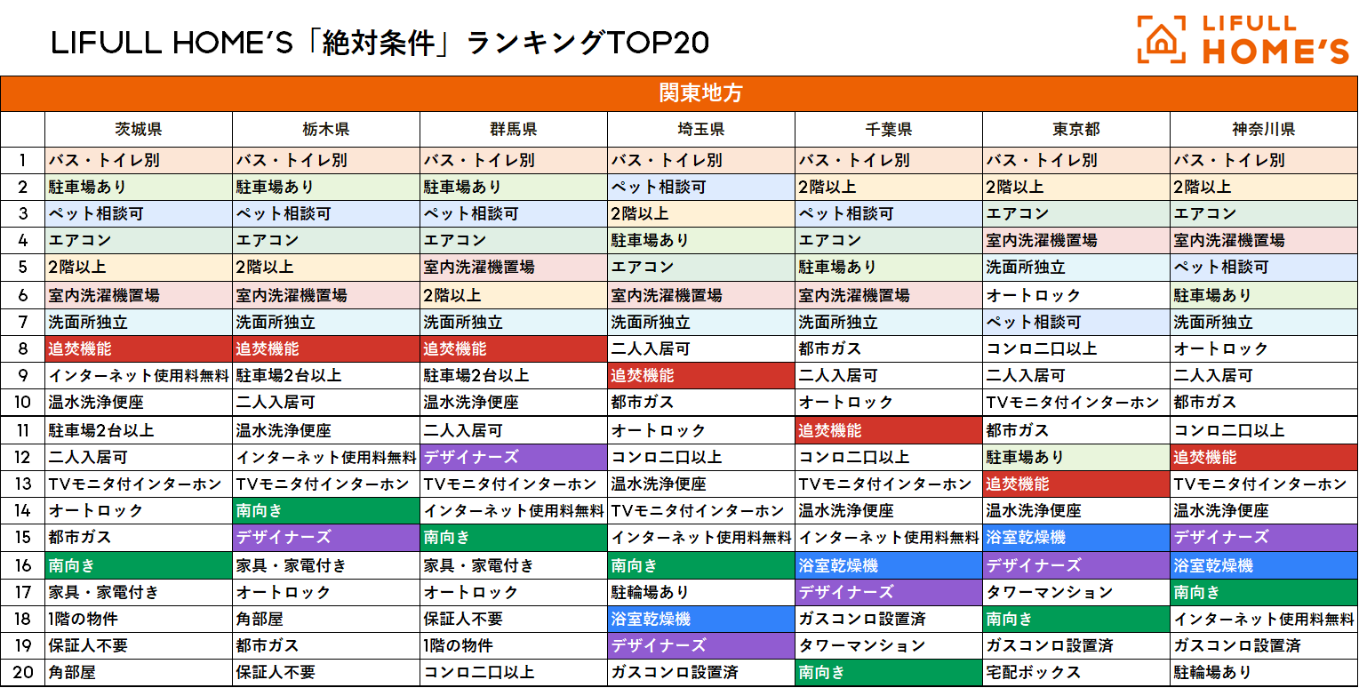 - 全国的に強い7つの「絶対条件」は「バス・トイレ別」「駐車場あり」「2階以上」「ペット相談可」「エアコン」「室内洗濯機置場」「洗面所独立」