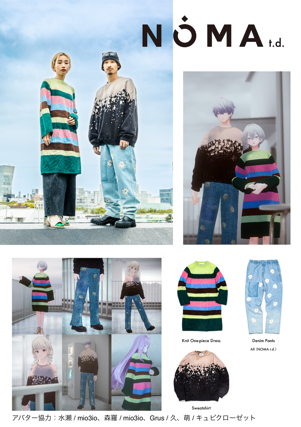 BEAMSバーチャルショップでセレクトする初のリアルブランドは、2005年にデザイナー野口 真彩子と佐々木 拓真がスタートした、手描きの個性的なテキスタイルと立体的なデザインが特徴のNOMA t.d.です。この秋発売予定のRay BEAMS別注のワンピースと、手染め柄や手刺繍を3Dで再現したスウェットシャツとデニムパンツの2スタイルを、バーチャル先行販売します。