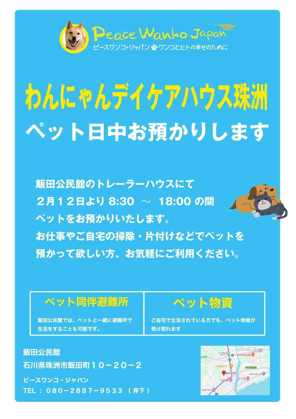 2月12日から「わんにゃんデイケアハウス珠洲」として日中のペット預かりの受け入れを開始し、被災された方々が、仕事や自宅の掃除・片付けのため、ペットと離れる必要がある時に飼育経験豊富なスタッフがお預かりし、健康観察や必要なサポートを行います。