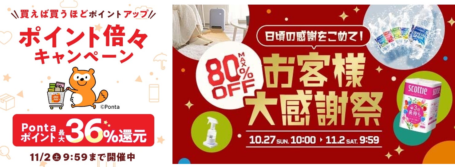 au PAY マーケット、10月27日からのポイント倍々キャンペーンで、日用品から家電までアイリスプラザなどの商品が最大80%オフで買える秋の超特価アウトレットセールを開催