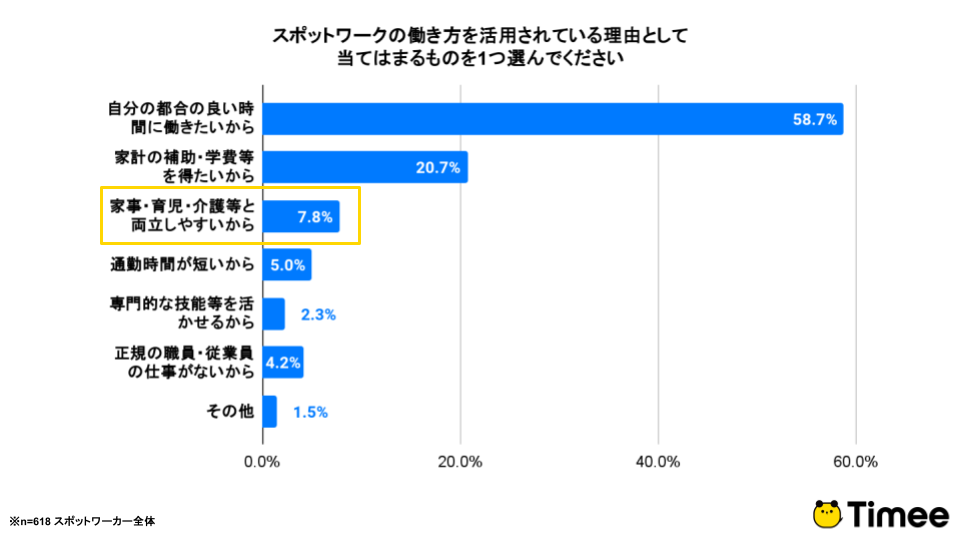 タイミーは、スポットワークが「働くことの敷居が低く、様々な体験をしやすい」、「1日・時間単位で働ける」といった特徴を持ち、家事・育児・介護等との両立がしやすい働き方であると考えています。実際に、スポットワーカーを対象にしたアンケート調査では、スポットワークの働き方を活用する理由として「家事・育児・介護等と両立しやすいから」と回答した人が7.8%存在しました。(※3 以下グラフ参照)