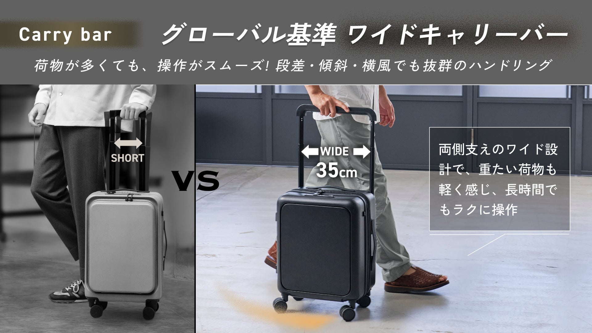一般的なスーツケースより左右幅の広いワイドキャリーバーを採用し、走行時の“ぐらつき”を大幅に軽減。荷物を入れても縦揺れしにくく、片手でもスムーズに扱えます。駅のホームや空港など長距離移動でも腕の疲れが出にくく、最後まで快適に転がせる安心感を体感できます。