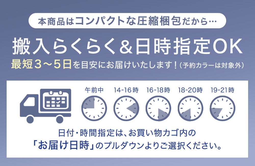 また、一般的なアイランドソファはサイズが大きく、搬入が大変という課題があります。本製品はコンパクトな圧縮梱包で宅配便でのお届けとなるため、最短3~5日でのお届けが可能となっており、日付指定にも対応しているため、受取もスムーズです。