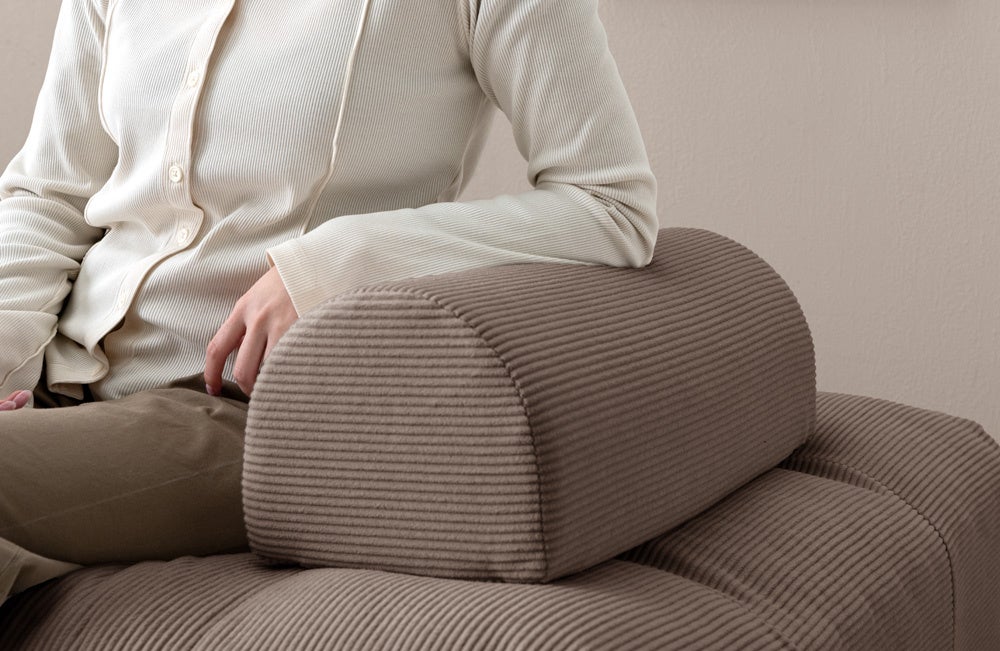 また、アームレスデザインでどこからでも座ることができ、背もたれや肘掛けに使える2種類のクッションで使用シーンや座る人の体格に合わせてクッションの置く場所を調整できます。