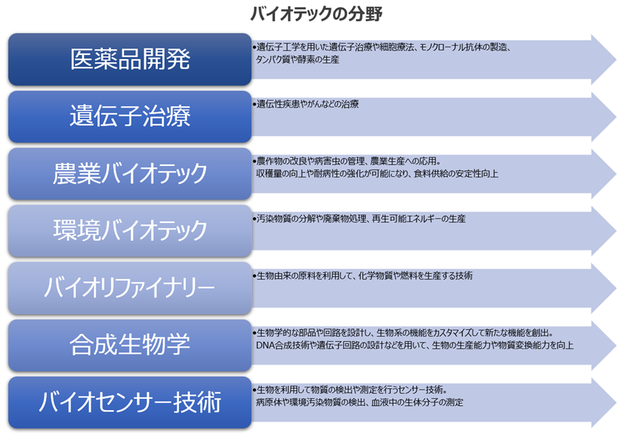 現代社会において、科学技術の進歩は私たちの生活や社会のさまざまな分野に大きな影響を与えています。その中でも、バイオテックは生物学と技術の融合により、医療、農業、環境、エネルギーなどの分野で革新的な解決策や持続可能な技術の開発に取り組んでいます。バイオテックの主な分野として、医薬品開発、遺伝子治療、農業バイオテック、環境バイオテック、バイオリファイナリー、合成生物学、バイオセンサー技術などがあります。医薬品の研究開発や治療法の進化、農業生産の効率化や食料供給の安定、環境保護や再生可能エネルギーの開発など、これらの分野においてバイオテックは重要な役割を果たしています。