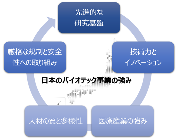 日本において、バイオテックは特に強力な優位性を持っています。その強みは、複数の要素によって支えられています。まず、日本は先進的な研究基盤を有しており、大学や研究機関によって行われる高品質な研究がバイオテックの分野で多く生み出されています。また、日本企業の技術力とイノベーションへの取り組みは顕著であり、バイオテックにおいても優れた製品や先端技術の開発が行われています。日本の医療産業の強みや高度な医療システムは、バイオテック企業が新たな治療法や製品の研究開発を効果的に進めることを可能にしています。日本の人材の質と多様性もバイオテックの強みの一つであり、優れた研究者や技術者の存在や異なる専門分野からの協働がイノベーションを促進しています。さらに、日本の厳格な規制と安全性への取り組みによって、信頼性の高い製品や技術の開発が行われることが求められています。これらの要素により、日本はバイオテックの分野において競争力を持ち、さまざまな可能性と成長の機会が存在しています。