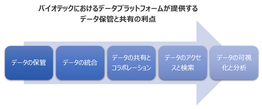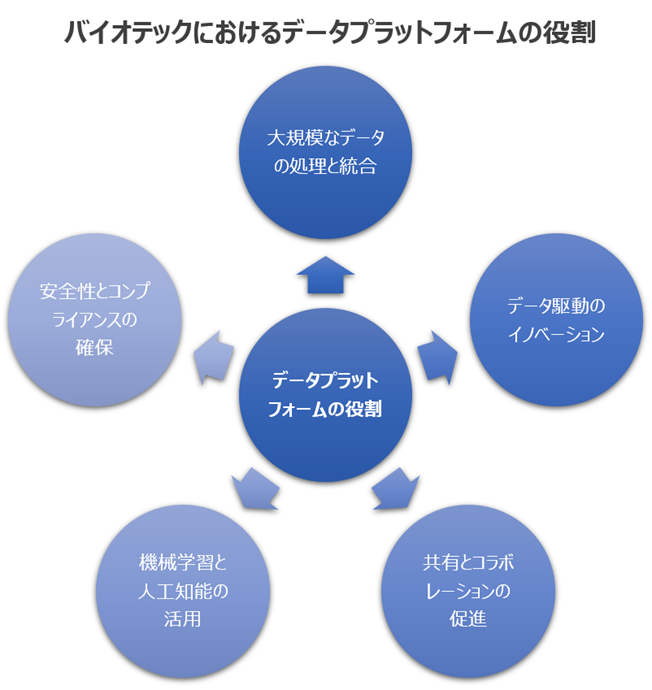 バイオテックは多岐にわたるデータを扱い、その処理、統合、解析、共有、保護が求められます。データプラットフォームは、このような要求に応えるための基盤として機能し、バイオテックの研究や開発を支える不可欠な要素となっています。具体的には、大規模なデータの処理と統合、データ駆動のイノベーションの促進、共有とコラボレーションの促進、機械学習や人工知能の活用、安全性とコンプライアンスの確保などが挙げられます。データプラットフォームの存在は、バイオテック研究者や企業にとって貴重な情報源であり、効率的なデータ活用と意思決定を支援します。さらに、データの共有やコラボレーションを容易にすることで、異なる研究者や組織間の相互作用を促進し、バイオテックの進展を加速させることが期待されます。