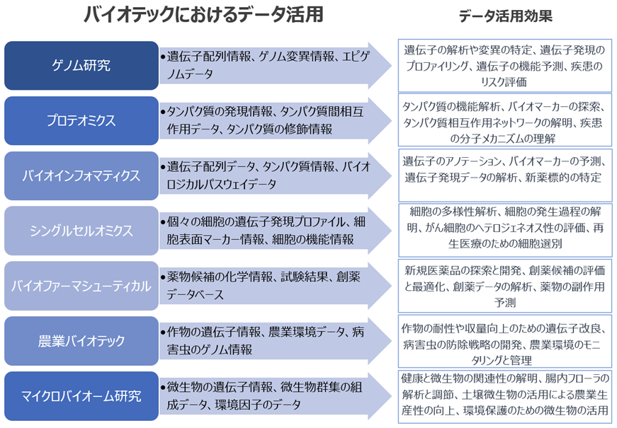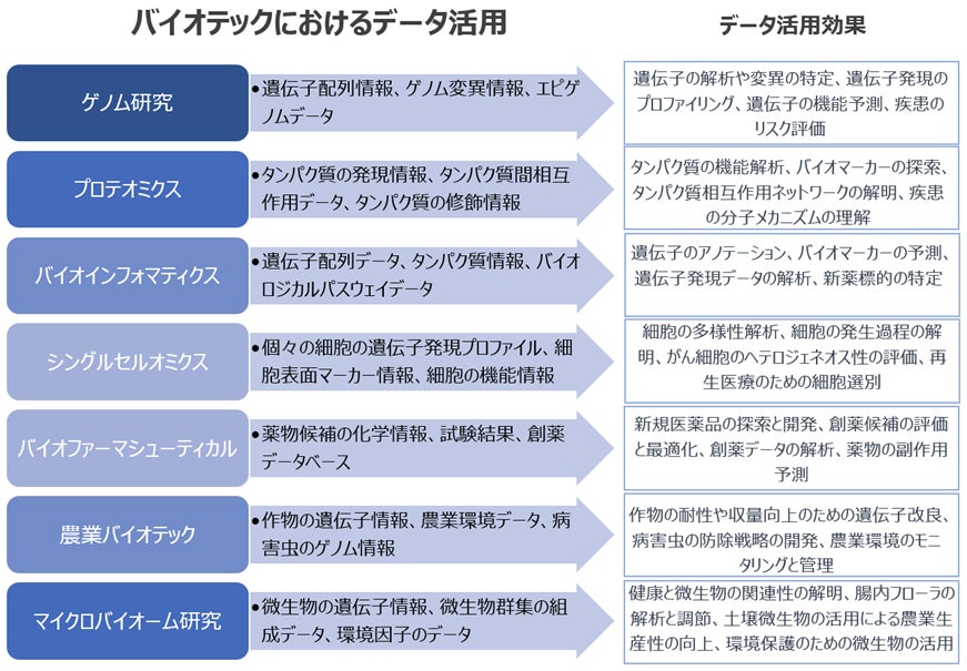 また、バイオテックは、さまざまな分野で幅広いデータを活用して革新的な成果を生み出しています。