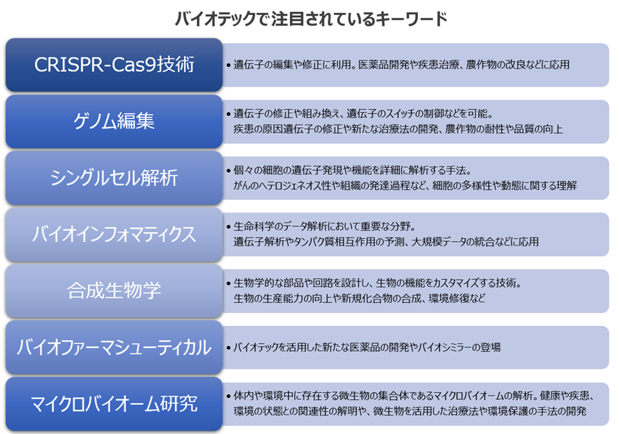 また、バイオテックにおいて、現在注目されている技術とトレンドはいくつかあります。例えば、CRISPR-Cas9技術やゲノム編集技術は、遺伝子の編集や修正に革新的な手法を提供し、医療や農業の分野での応用が進んでいます。また、シングルセル解析やバイオインフォマティクスは、生物の個々の細胞や大規模なデータの解析を通じて新たな知見を得るための手法です。合成生物学やバイオファーマシューティカルの分野では、生物の機能をカスタマイズして新たな製品や治療法の開発が行われています。イクロバイオーム研究は、微生物の集合体であるマイクロバイオームの解析や応用研究が進んでいます。これらの技術とトレンドは、バイオテックの研究開発や産業の進展において重要な役割を果たしています。