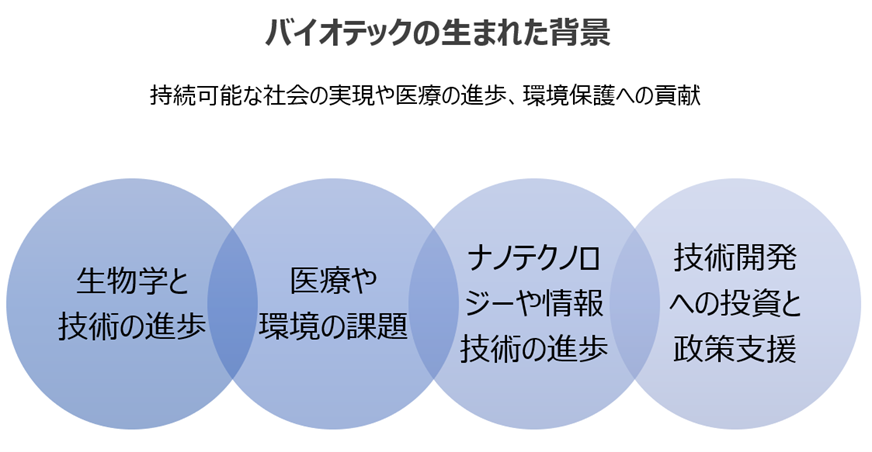近年、科学技術が目覚ましく進歩しています。このような進歩は、私たちの日常生活や社会の様々な分野において大きな影響を与えています。この技術の背景には、生物学と技術の進歩、医療や環境の課題、ナノテクノロジーや情報技術の進展、そして技術開発への投資や政策支援などが挙げられます。バイオテックの発展は、持続可能な社会の実現や医療の進歩、環境保護に大いに貢献することが期待されています。