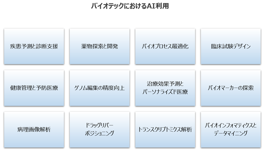 以下に、バイオ業界におけるAI活用の具体的な例を挙げます。