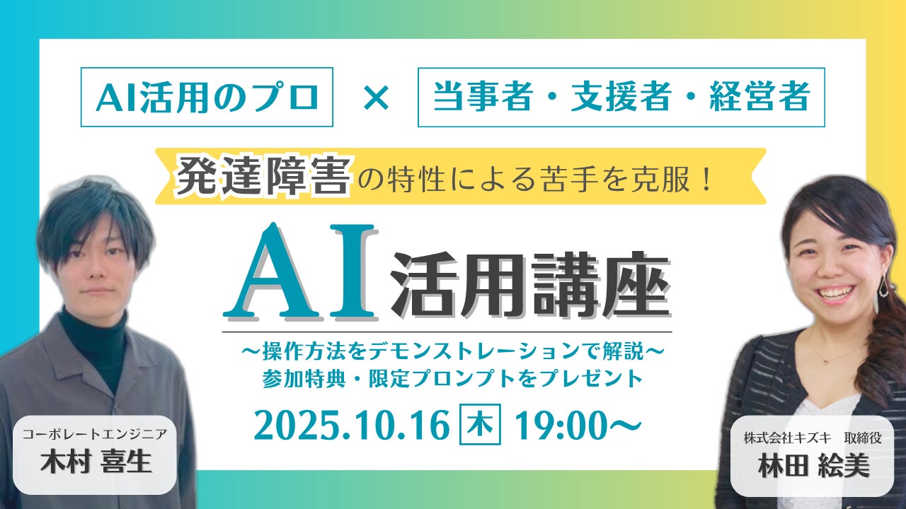発達障害による苦手を克服するための“AI攻略法”を紹介する無料オンライントークイベントを開催。大手IT企業でAI活用推進に携わるエンジニアの木村喜生氏とキズキ取締役・林田が登壇します。