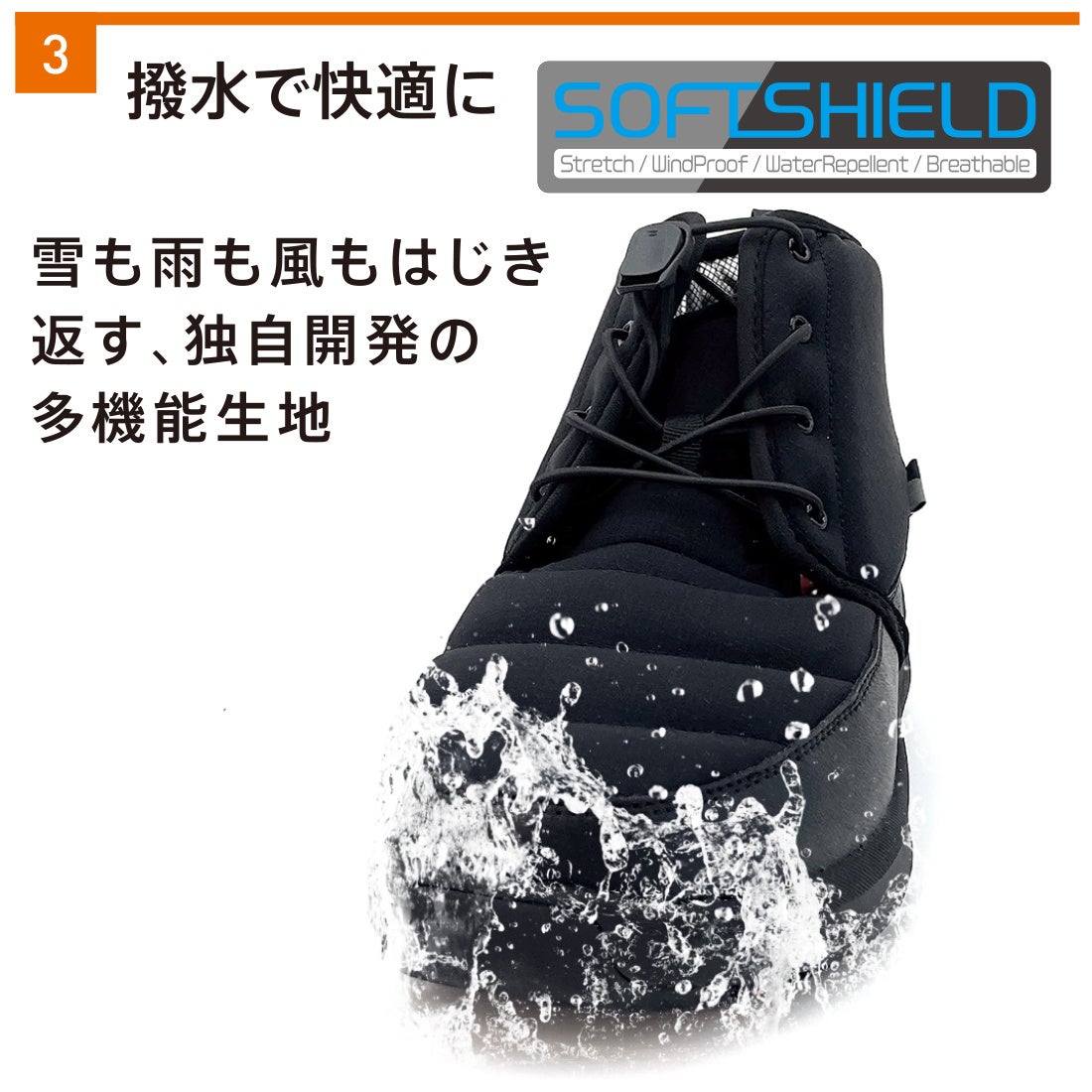 ③雪も雨も風もはじき返す撥水生地「SOFTSHIELD」