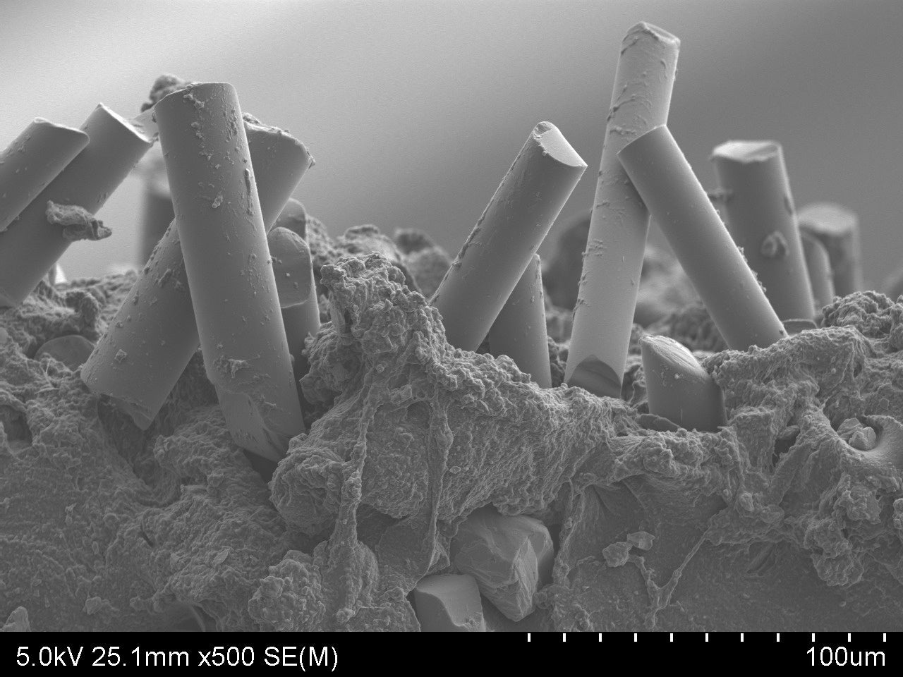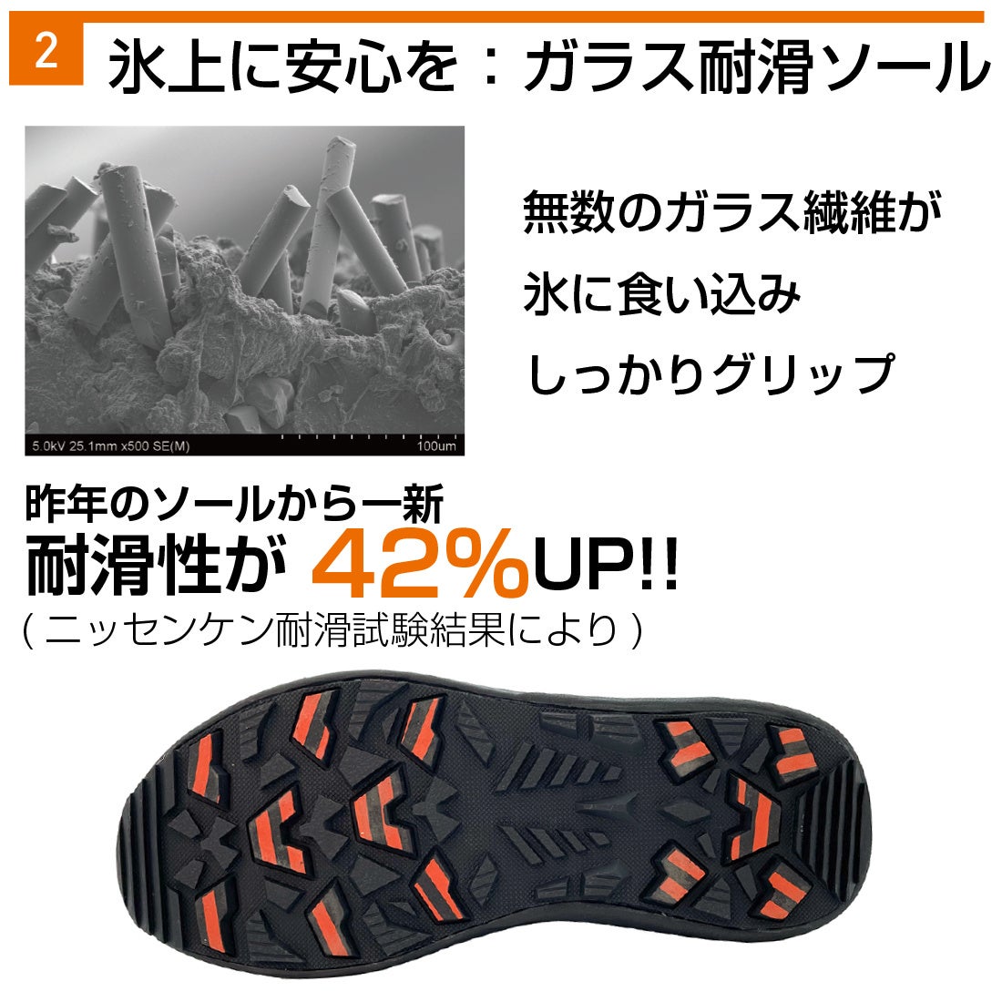 ②無数のガラス繊維が氷に食い込む「ガラス耐滑ソール」
