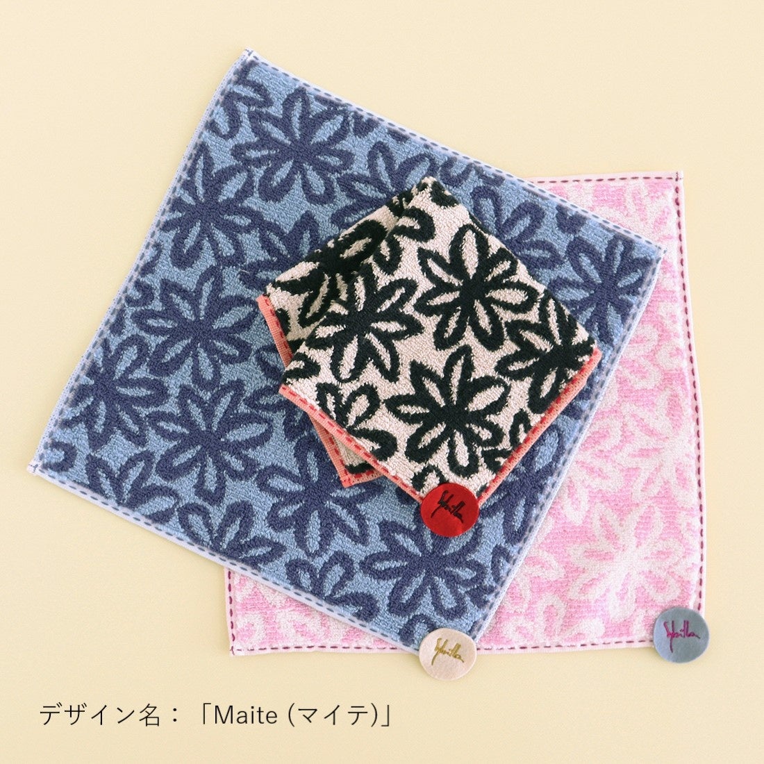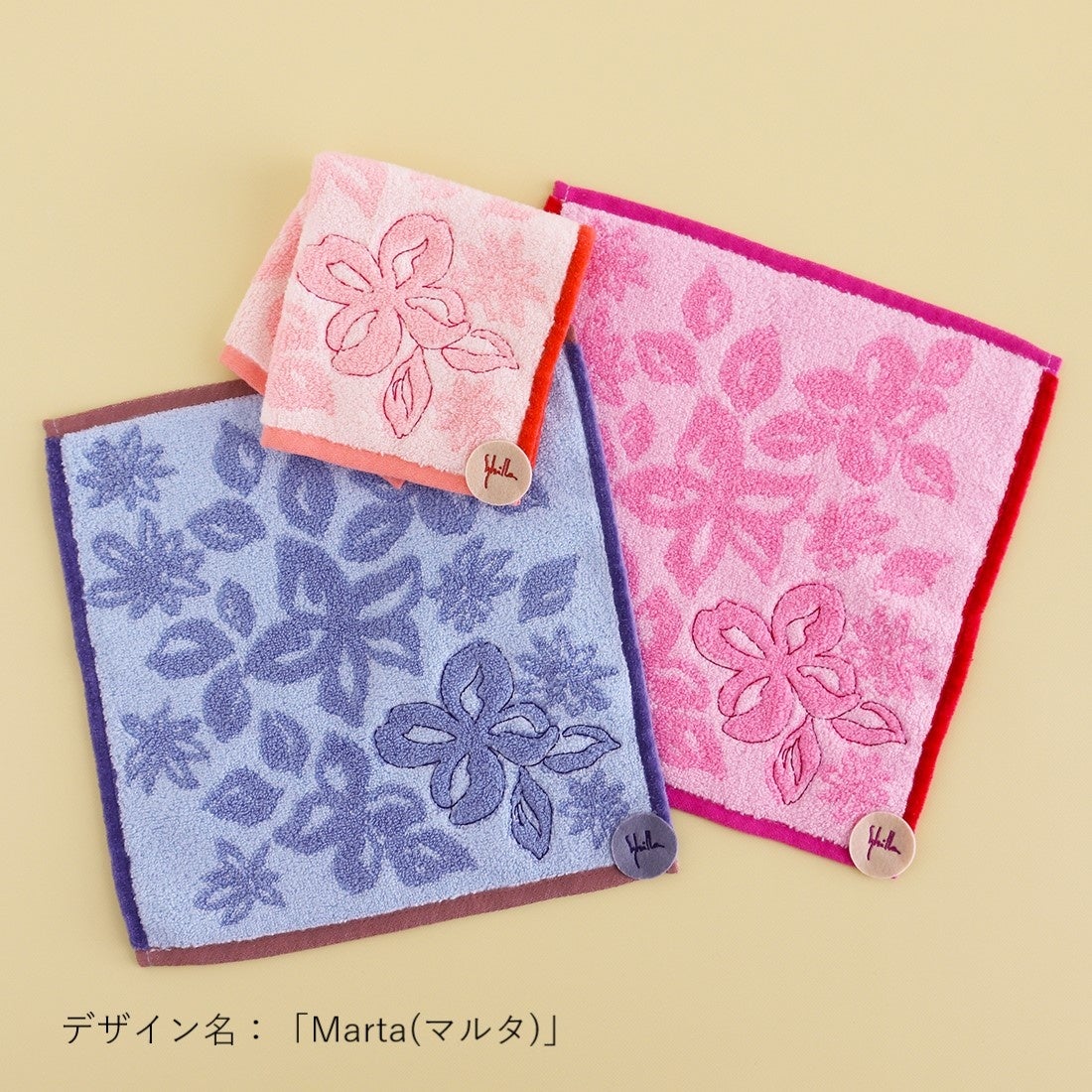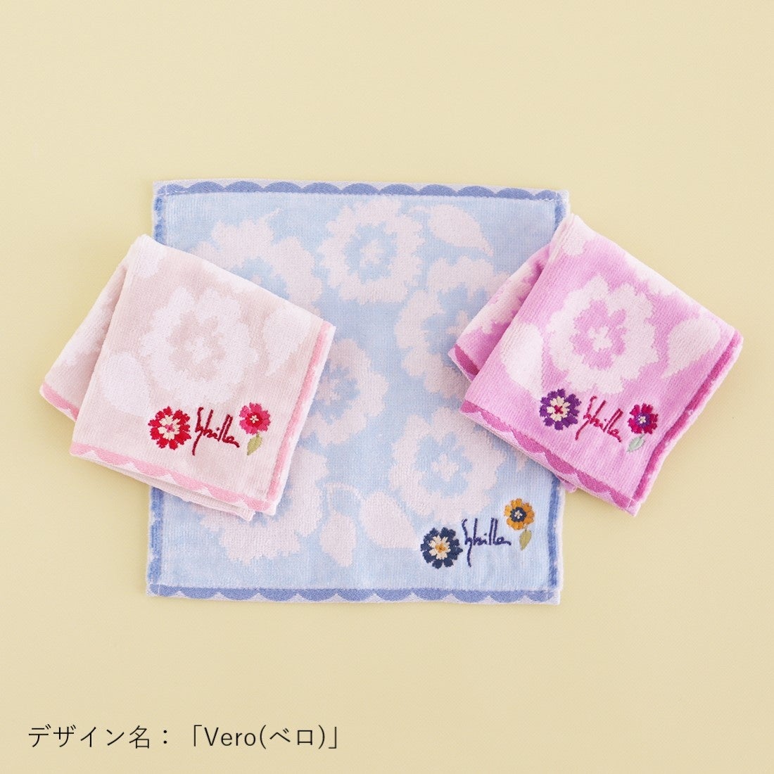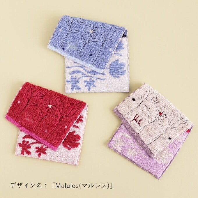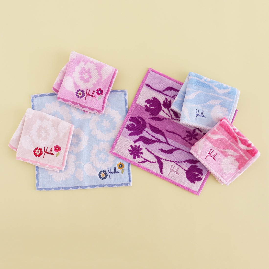 大きな花を全体にパイルで表現し、右下にビビットなカラーで刺繍を施した一枚とシンプルなデザインをグラデーションカラーで華やかに演出したミニサイズのタオルハンカチです。ミニサイズのタオルハンカチは小さめのバッグにも入れられ、かさばらないので2枚持ちにもおすすめです。
