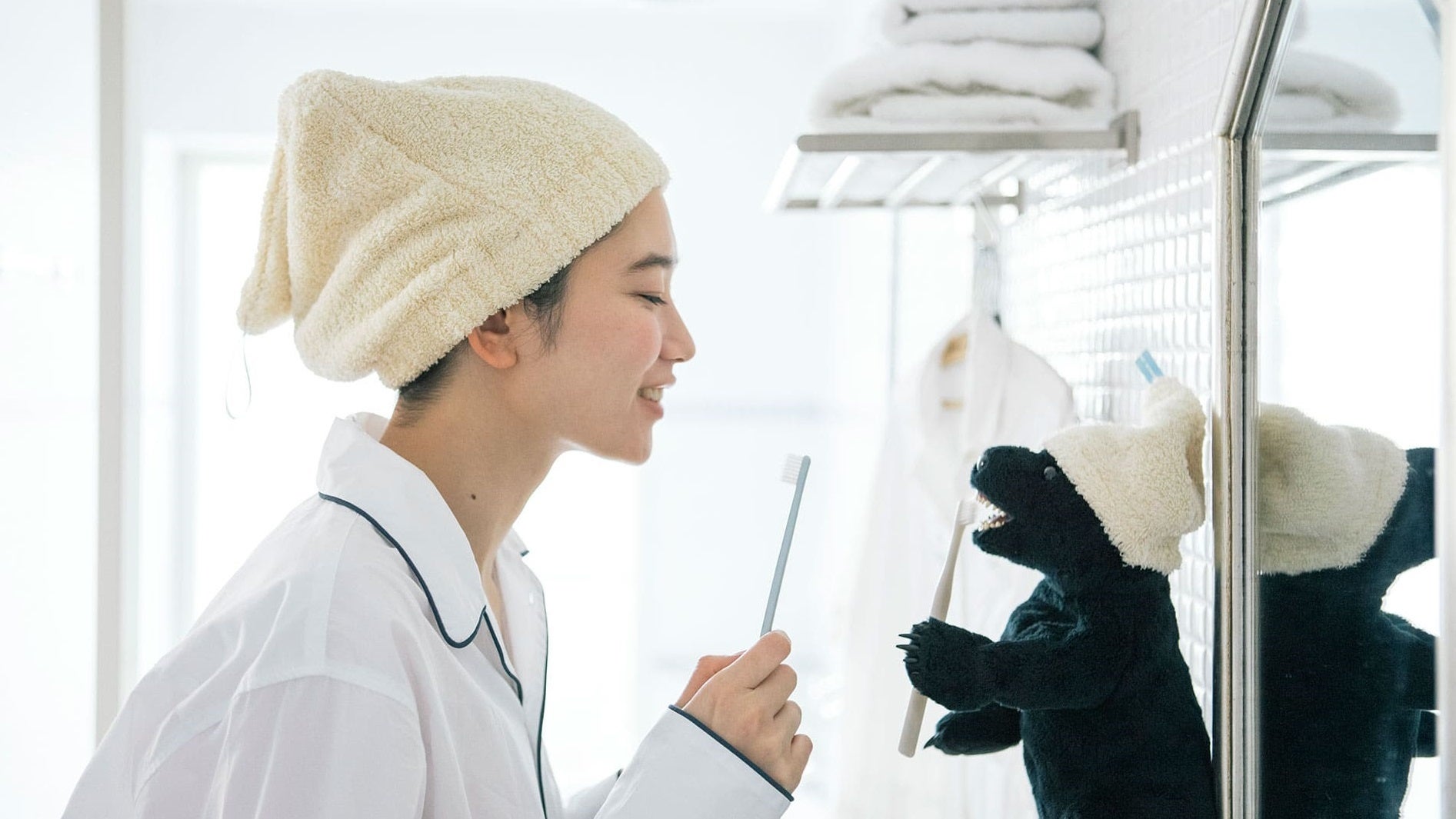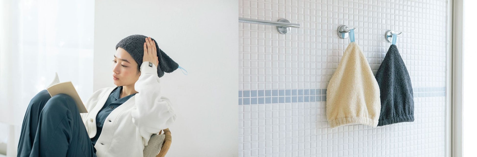 快眠セラピストの三橋美穂さん(「ねむれないくまのために」顧問)は、「入浴後、1時間で寝る」ことがよい睡眠につながると言います。その1時間でやることはわりとたくさん。濡れた髪を乾かすのも、そのひとつです。そこで、「ドライヤーを使わずに髪を乾かせたら」という考えから誕生したのが『くまもかわくタオルキャップ』です。寝具メーカー・ディーブレスさんが開発した、「ザ・ラストタオル」の生地を使って、オリジナルでつくりました。