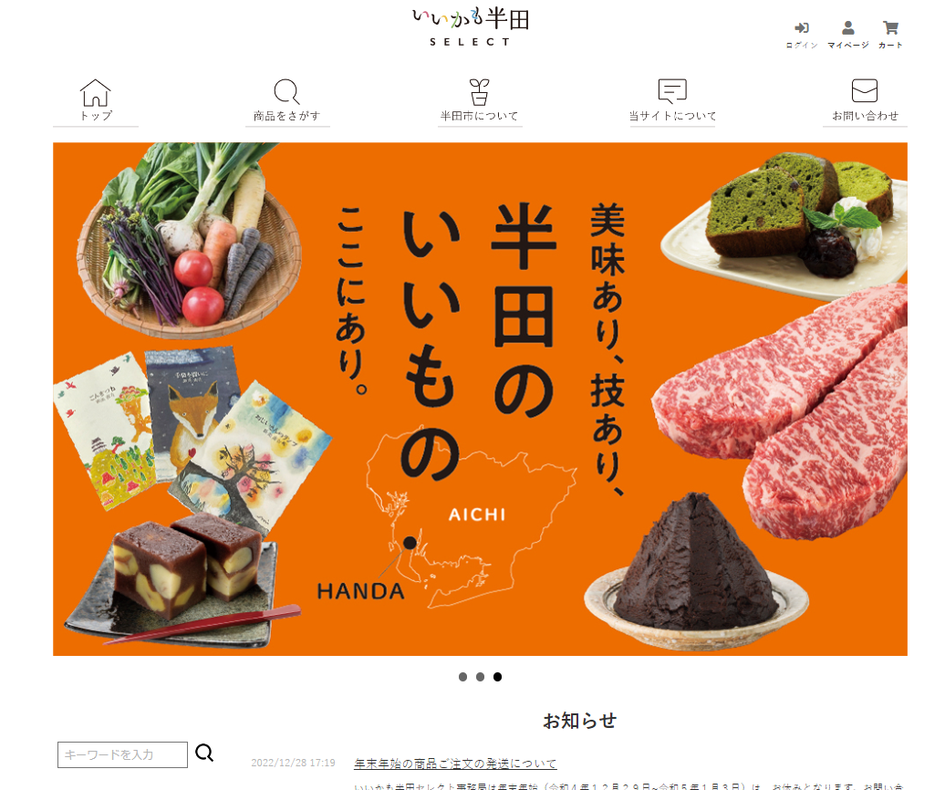 「いいかも半田セレクト」は、市内物産品の認知度向上及び消費拡大を目的とした物産品お取り寄せサイトです。