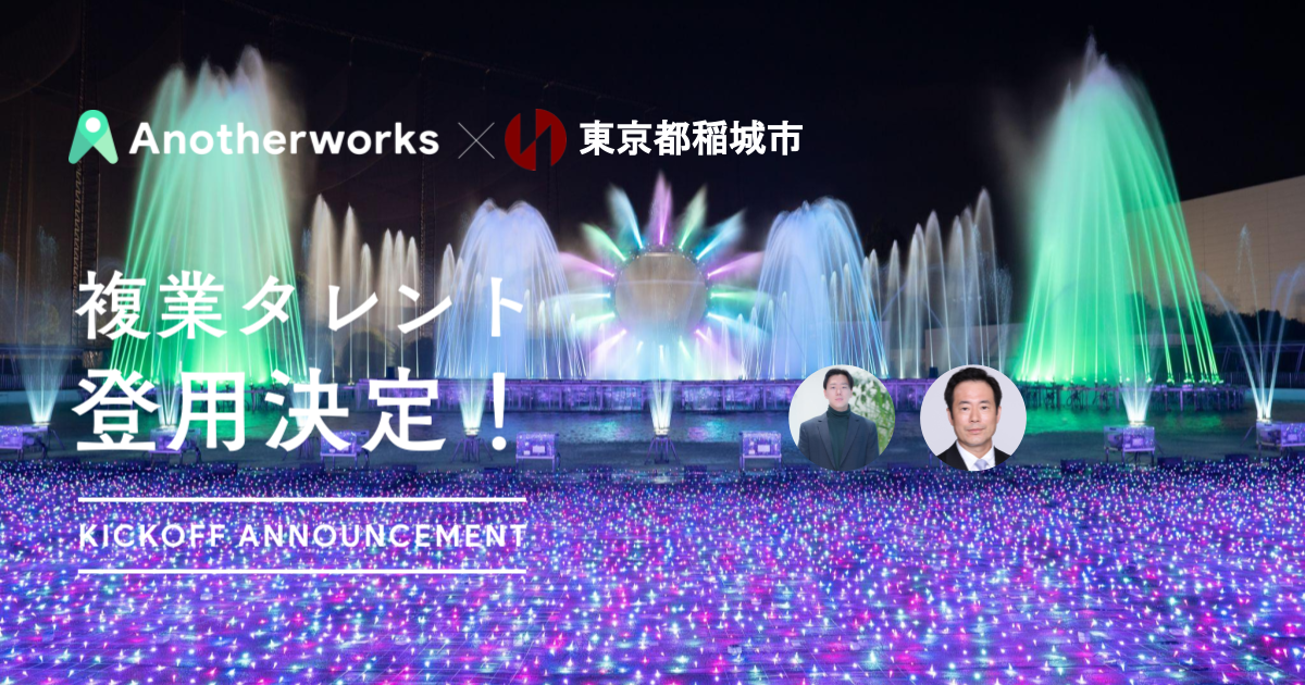 そこで弊社では、複業クラウドを活用し全国の自治体が抱えるさまざまな課題と、その課題を解決できるスキルをもつ複業人材とのマッチングを支援することで、地方創生に貢献できないかと考え、自治体との連携を推進しています。稲城市とAnother worksは、2023年4月に連携し、行政へ複業人材を登用する実証実験を開始しました。