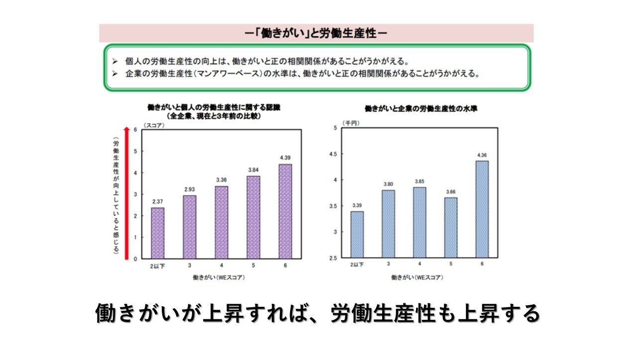 さらに、厚生労働省の調査によると、ワーク・エンゲージメント(従業員の働きがい)が上昇すればするほど、労働生産性も上昇することがわかっています。