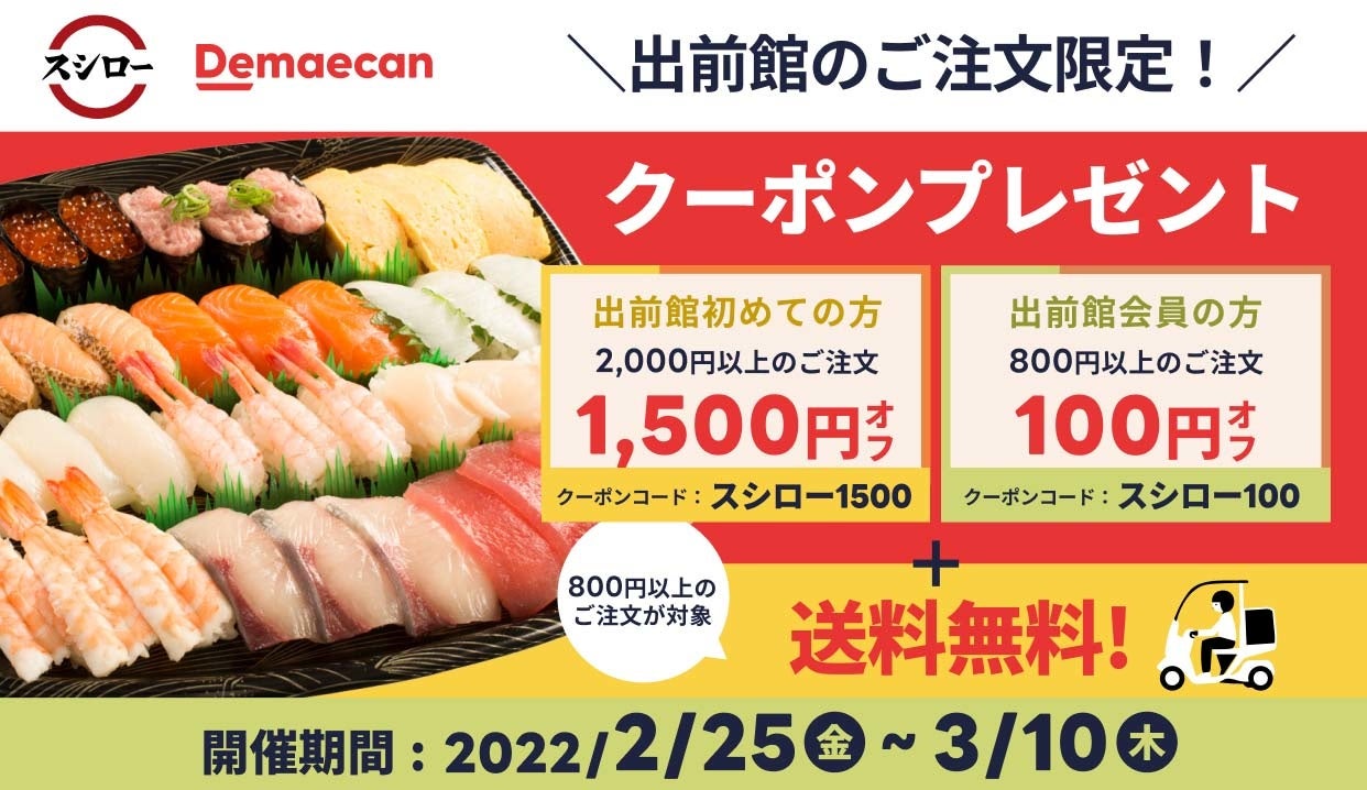 株式会社あきんどスシロー(本社:大阪府吹田市、代表取締役社長:堀江 陽)は、2月25日(金)~3月10日(木)までの2週間、出前サービス「出前館」(運営:株式会社出前館)とコラボした超お得なキャンペーンを実施いたします。キャンペーン期間中に「出前館」にて、スシローがご提供する商品をご注文いただき、クーポンコードを入力いただくと、送料無料に加え、最大1,500円オフ※にてお楽しみいただくことができます。