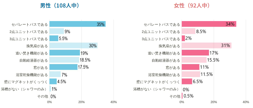 性別もあまり関係なく、男女ともにセパレートを望む傾向が強いことがわかりました。なお、男女別で顕著な差があったのは換気扇の有無/浴室乾燥機の有無/窓の有無の3点。